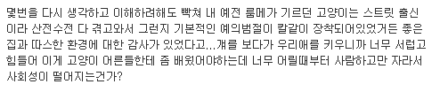 내가 무슨 앞으로굴러 뒤로굴러 이렇게 칼복종하라는것도 아니고 기본적으로 사람이 나가고 들어올때 아는척은 해야되는거아니야? 고양이가 주종개념 없는건 알지만 친구로는 생각한다는데..친구가 추운날씨에 일하러간다는데 거기대고 방구를 싸는건 어디서 배운 매너일까 난 그렇게 가르친적이 없어