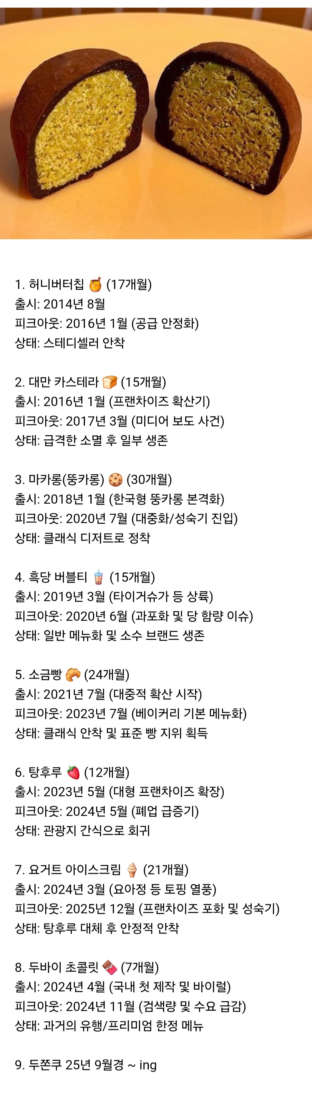 [흥미돋]대한민국 유행 디저트별 생애 주기 작성자성규특별시|작성시간26.01.15|조회수58,256 목록 댓글 81 글자크기 작게가 글자크기 크게가 출처: https://theqoo.net/square/4061802993 다음검색 현재 게시글 추가 기능 열기 북마크 공유하기 신고 센터로 신고 댓글 댓글 81 댓글쓰기 답글쓰기 댓글 리스트 작성자호호실실 | 작성시간 26.01.15 3두쫀쿠=치킨 말이되냐고 작성자Bbokmuyhj | 작성시간 26.01.15 두바이초콩릿은 좀 약하고 소금빵은 스테디됐네ㅠㅋㅋㅋ 작성자딩푸딩푸딩 | 작성시간 26.01.15 안정적 안착ㅋㅋㅋㅋㅋ 작성자유리심장 | 작성시간 26.01.15 명랑핫도그 왜 끝났냐고…집 가까이에 있던것들이 다 사라졌어ㅡㅡ 작성자nowjqn | 작성시간 26.01.16 오와지금이라도 팔까.. 댓글 전체보기