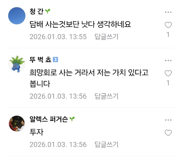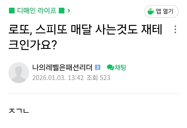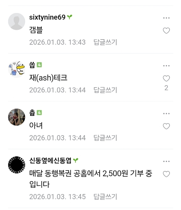 [흥미돋]로또, 스피또 매달 사는 것도 재태크인가요? 작성자야호우|작성시간26.01.15|조회수9,575 목록 댓글 49 글자크기 작게가 글자크기 크게가 출처: 여성시대 (야호우)내 로또는 투자임ㅋ 🤑 다음검색 현재 게시글 추가 기능 열기 북마크 공유하기 신고 센터로 신고 댓글 댓글 49 댓글쓰기 답글쓰기 댓글 리스트 작성자Be합리적사고 | 작성시간 26.01.15 곗돈내차례가 언제올지 모르는 곗돈... 작성자즐건하루 | 작성시간 26.01.15 연말정산 공제 안되는 기부 작성자인류의보석 | 작성시간 26.01.15 재ㅋㅋㅋ 작성자조 윤 민 | 작성시간 26.01.15 기부^^.. 작성자Karman Vortex | 작성시간 26.01.15 투자... 사면 당첨기회라도 있지안사면 안온다... 댓글 전체보기
