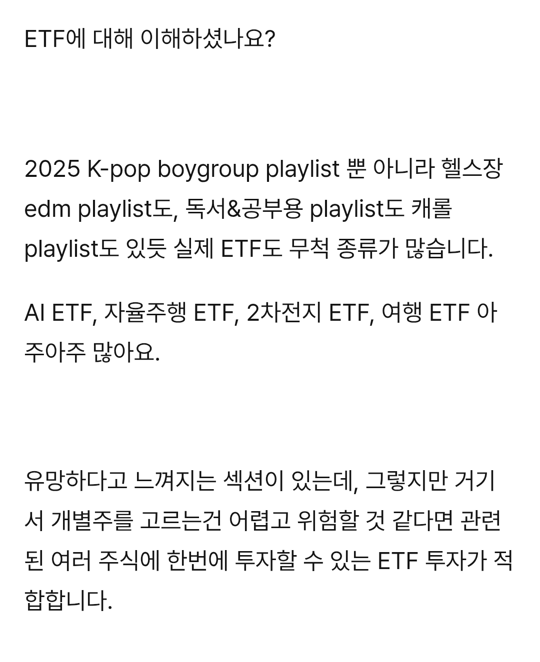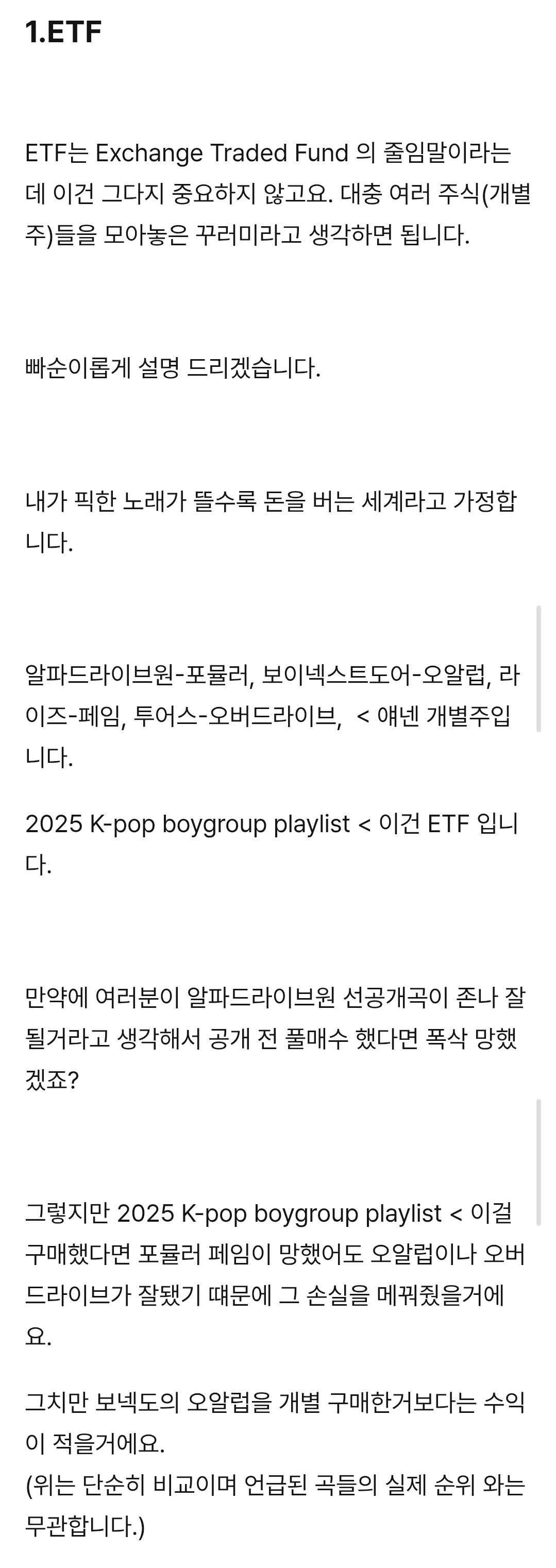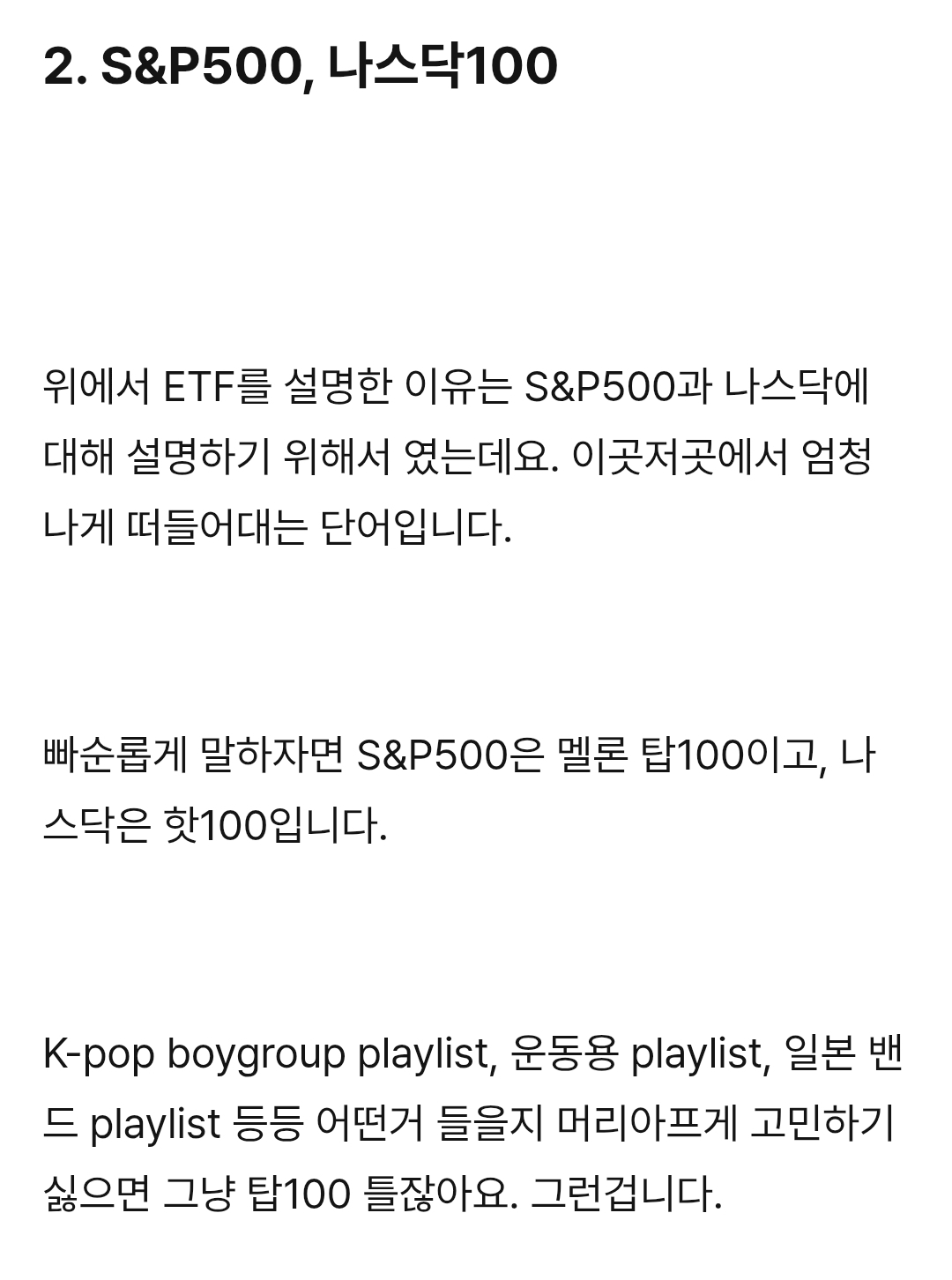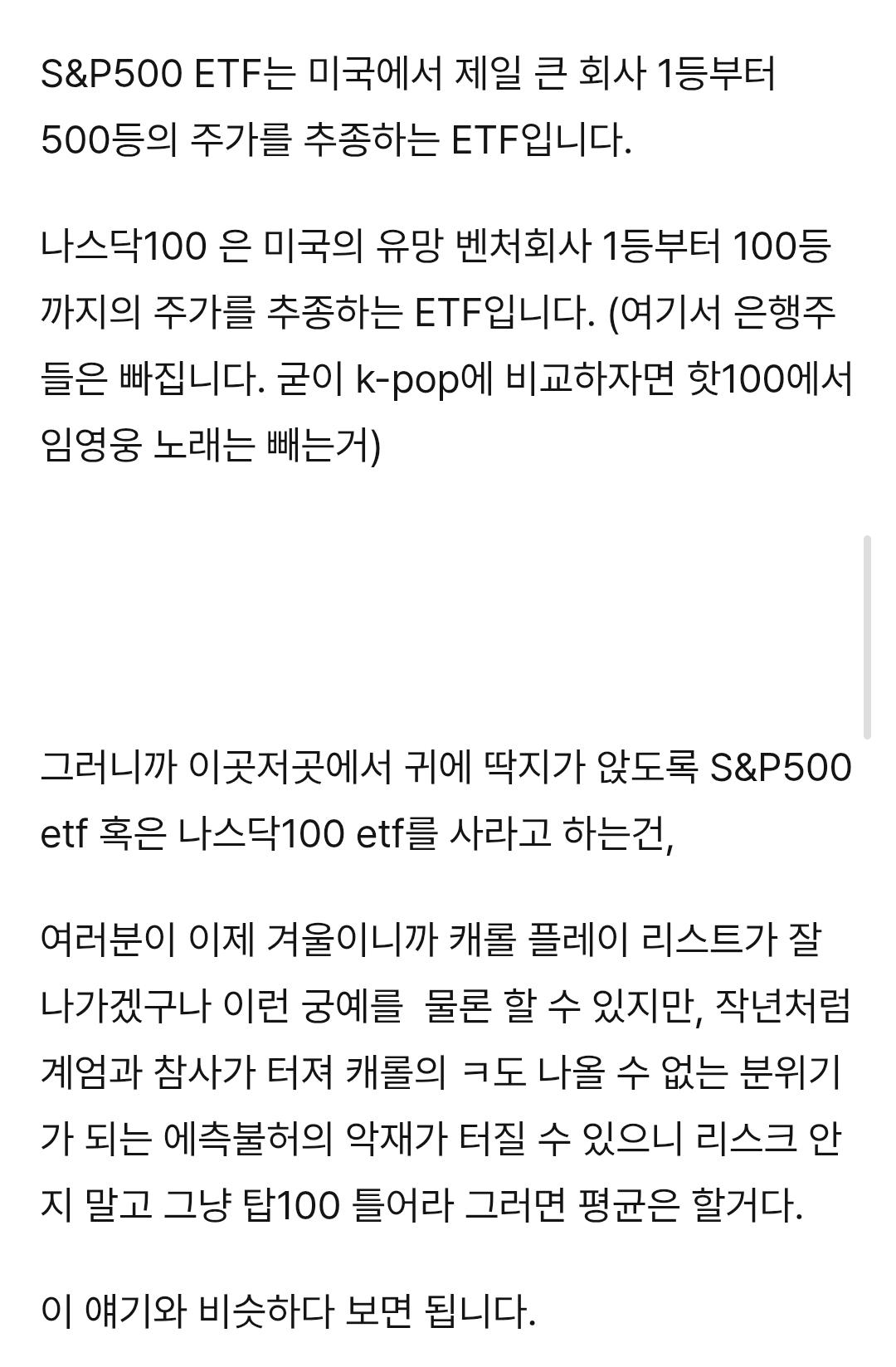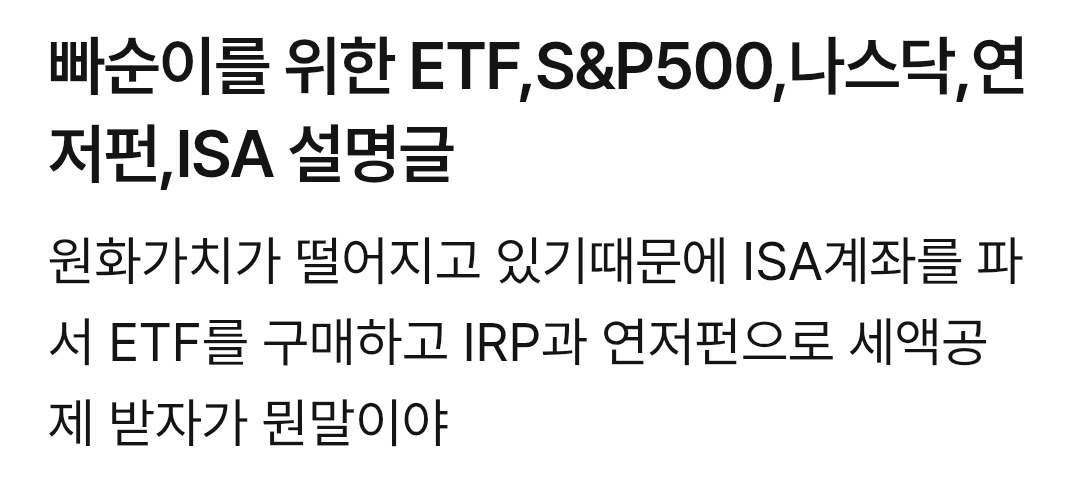 [흥미돋]빠순용어로 ETF, S&P500, 나스닥100 설명하기.txt 작성자콘옥수수콘|작성시간26.01.15|조회수80,347 목록 댓글 395 글자크기 작게가 글자크기 크게가 출처:https://posty.pe/r3wd8khttps://posty.pe/r3wd8k빠순이를 위한 ETF,S&P500,나스닥,연저펀,ISA 설명글: letsgobooooooja*해당글은 트친들을 위해 탐라 공유용으로 25년말 작성했던 글입니다. ‘원화가치가 떨어지고있기때문에 예적금만 하다가 거지된다’ ‘모르겠으면 S&P500이나 QQQ를 사면 된다.’ ‘ISA계좌 파서 www.postype.com전문은 여기(나도 이후는 구매 안해서 뭔내용있는지 모름) 다음검색 현재 게시글 추가 기능 열기 북마크 공유하기 신고 센터로 신고 댓글 댓글 395 댓글쓰기 답글쓰기 댓글 리스트 작성자칼옥분 | 작성시간 26.01.31 감사합니다 해당 댓글은 작성자와 운영진만 볼 수 있습니다. 작성자리본햄 | 작성시간 26.02.04 이해완 고마워 ㅋㅋㅋ 작성자imnayeon | 작성시간 26.03.09 고마워요 ♡ 작성자내란의him | 작성시간 26.03.09 진짜 똑똑하다 댓글 전체보기