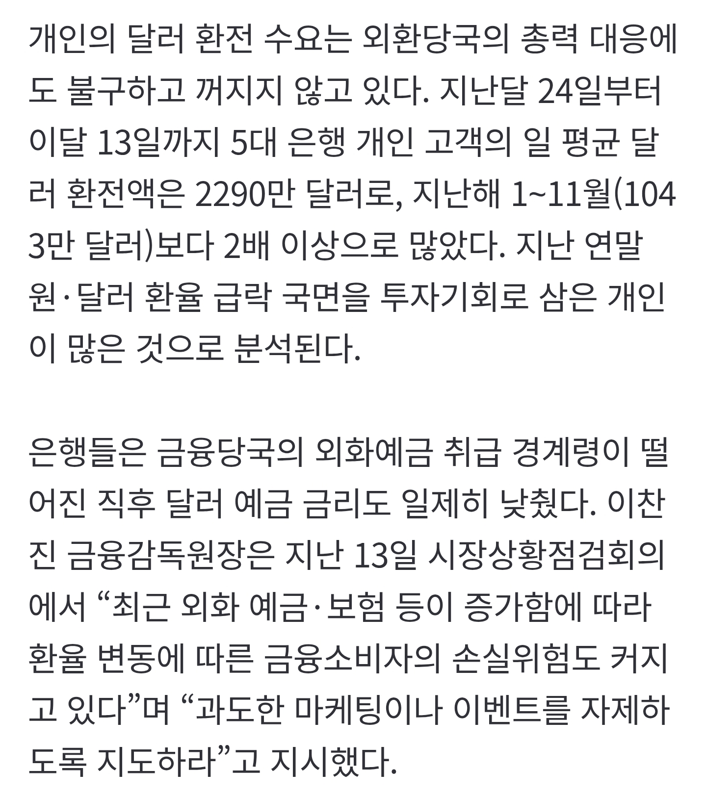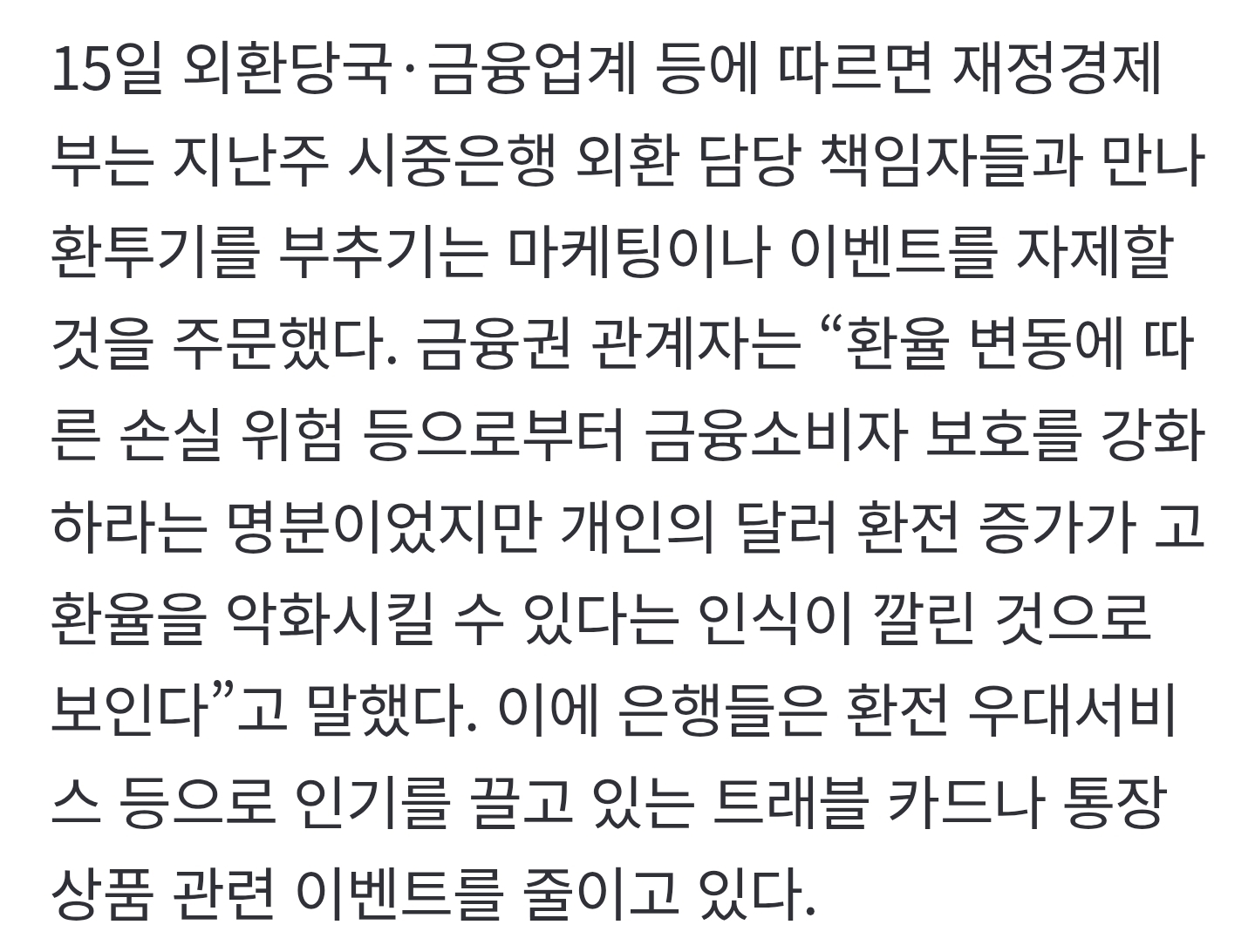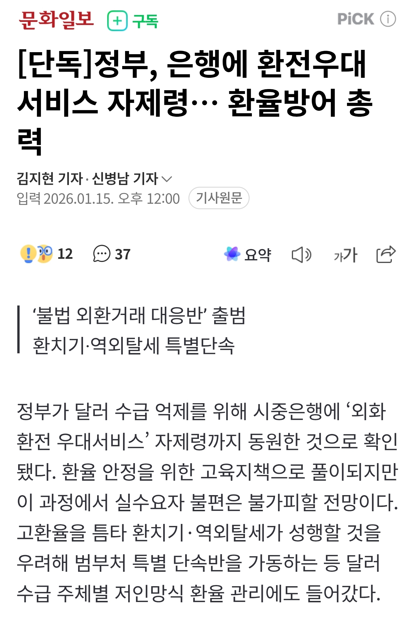 [여시뉴스데스크][단독]정부, 은행에 환전우대 서비스 자제령… 환율방어 총력 작성자평화수호자|작성시간26.01.15|조회수37,350 목록 댓글 204 글자크기 작게가 글자크기 크게가 출처: https://naver.me/FQyOqwP6[단독]정부, 은행에 환전우대 서비스 자제령… 환율방어 총력정부가 달러 수급 억제를 위해 시중은행에 ‘외화 환전 우대서비스’ 자제령까지 동원한 것으로 확인됐다. 환율 안정을 위한 고육지책으로 풀이되지만 이 과정에서 실수요자 불편은 불가피할 n.news.naver.com 다음검색 현재 게시글 추가 기능 열기 북마크 공유하기 신고 센터로 신고 댓글 댓글 204 댓글쓰기 답글쓰기 댓글 리스트 작성자더들리 | 작성시간 26.01.17 적금만기되면 걍 예금안하고 달러환전해서 미주해야겠다ㅠ 작성자루마리티 | 작성시간 26.01.17 미친새기네진짜 탄핵시켜 무슨 일개미들 개인 자산을 건드려 작성자하라이지 | 작성시간 26.01.17 북한이냐 작성자사진학도 | 작성시간 26.01.18 다 뒤지자.... 작성자군고구마하나요 | 작성시간 26.02.28 연어왔는데 댓글 개욱기뇌 ㄷㄷ ㅋㅋ 댓글 전체보기