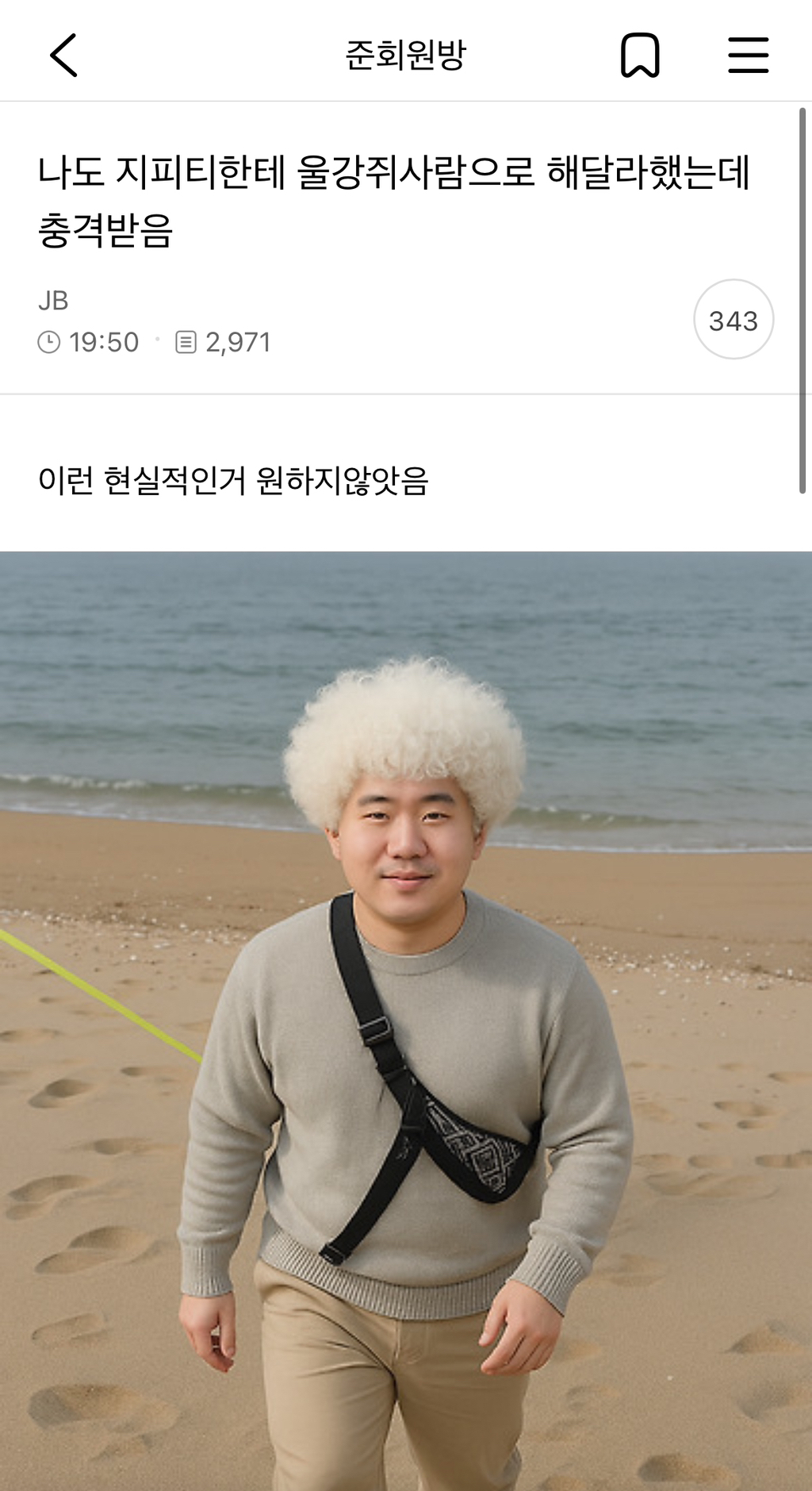 [스크랩] [흥미돋]지피티 강아지 준웃 작성자열렬한붕어빵장수|작성시간26.01.15|조회수24,683 목록 댓글 23 글자크기 작게가 글자크기 크게가 개웃김 다음검색 스크랩 원문 : 쭉빵카페 현재 게시글 추가 기능 열기 북마크 공유하기 신고 센터로 신고 댓글 댓글 23 댓글쓰기 답글쓰기 댓글 리스트 작성자fbejdisbebn | 작성시간 26.01.15 저금통 조낸 웃겨 작성자리얼이재명쓰명수한상황 | 작성시간 26.01.15 아진짜존나웃기다ㅜㅜㅠㅠㅜ아 작성자nowjqn | 작성시간 26.01.15 강아지도 보여주짘ㅋㅋ ㅜ 작성자요루시카 | 작성시간 26.01.16 저금통 미칫나 개웃기다 작성자암국 | 작성시간 26.01.24 아 저금통ㅋㅋㅋㅋㅋㅋㅋㅋ 댓글 전체보기
