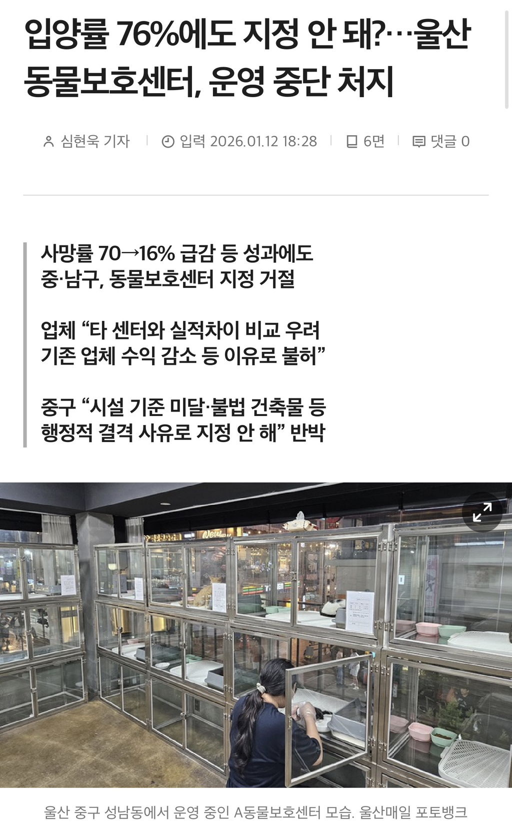 울산은 유기동물 보호 중 사망률 70% 이상, 입양률 20% 미만인 전국 최하 위권 보호 현실을 안고 있는 지역이에요. 이 구조를 바꾸겠다며 A센터가 등장 했지만, 지자체 지정 문제에 발목이 잡혔다고...
