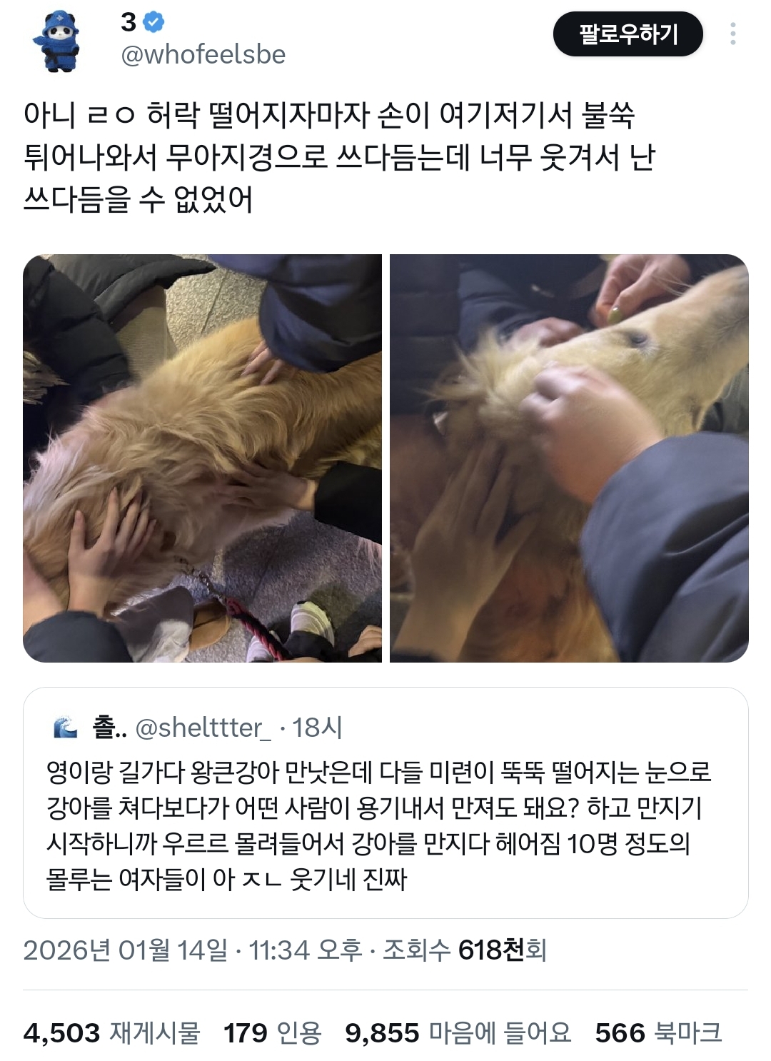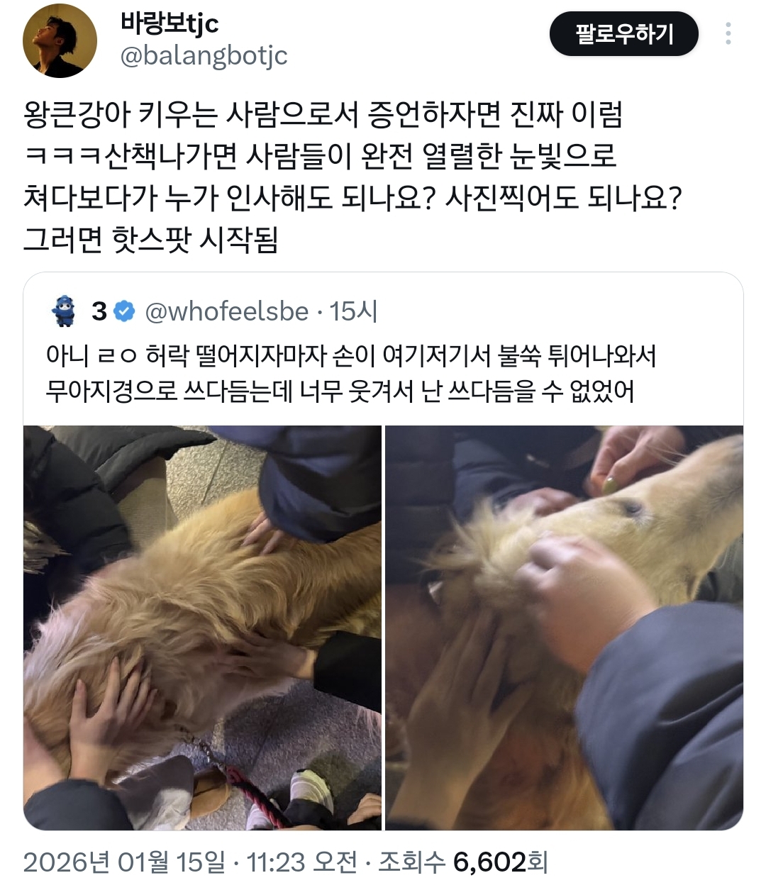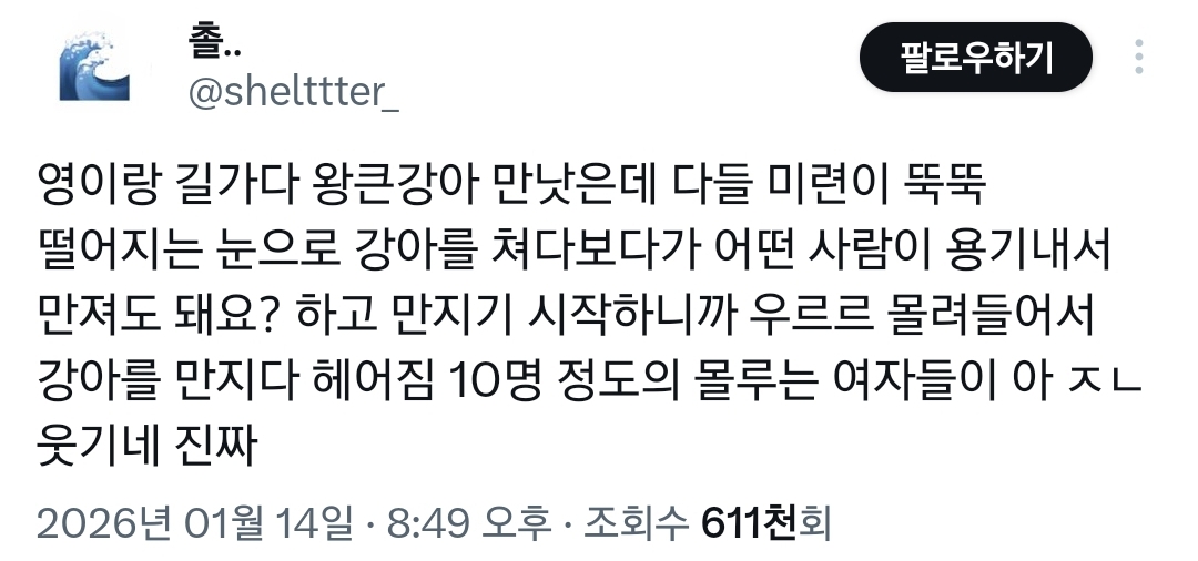 작성자빵녕하세요 작성시간 26.01.15 나도 어제 강아 데리고 산책하는데 저 멀리서부터 계속 주춤주춤 거리면서 가는 것도 아니고 멈춘 것도 아닌 어정쩡한 걸음의 여성분이 계속 강아 쳐다보고 강아도 내가 아는 인간인가 싶어서 가다 멈추고 가다 멈추고 이 짓만 몇분 하다가 결국 내가 먼저 줄 풀고 인사하실래요..? 함ㅋㅋㅋㅋㅋ울 강아는 여성분이 계속 안절부절 귀엽다면서 주머니에 손 넣고 빼고 반복하니까 간식 주는 줄 알고 그 앞에 앉고..ㅋㅋㅋㅋㅋㅋㅋ