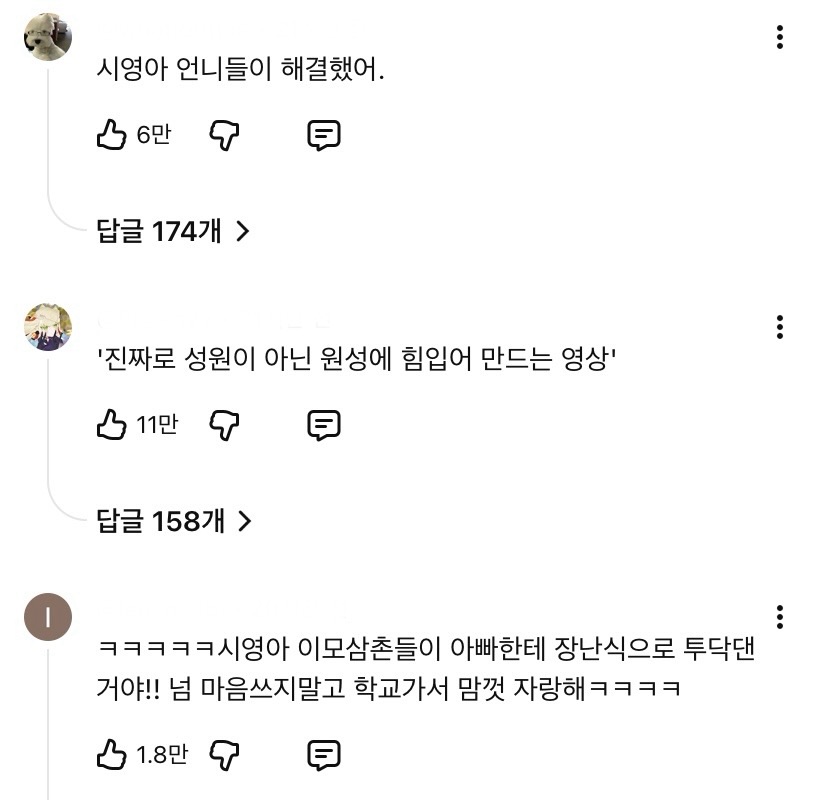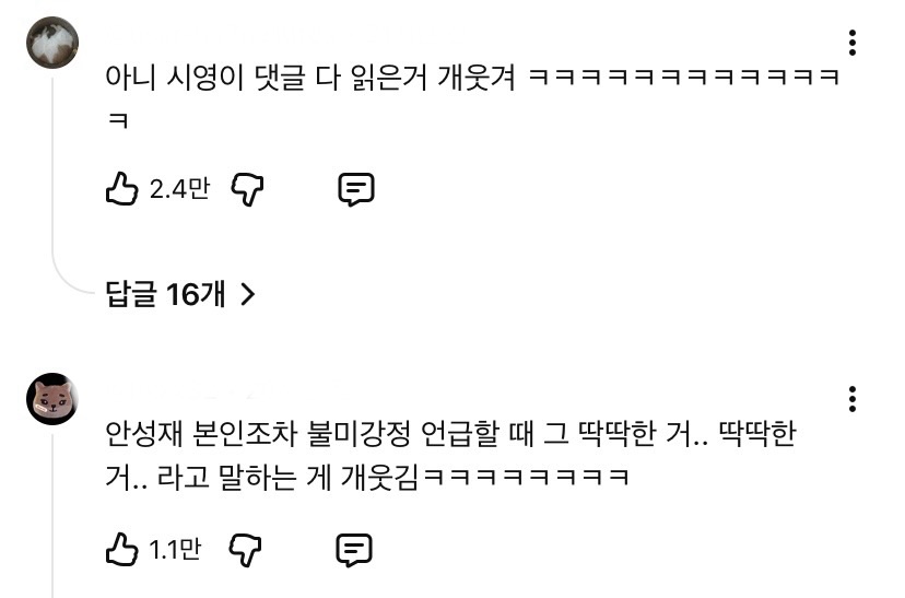 작성자바쁜강쥐 작성시간 26.01.16 두딱강 두란말이가 ㅈㄴ 웃김 진짜ㅋㅋㅋㅋㅋㅋㅋ 그리고 뭐 할때마다 댓글 캡쳐로 띄우는거 존나웃곀ㅋㅋㅋ