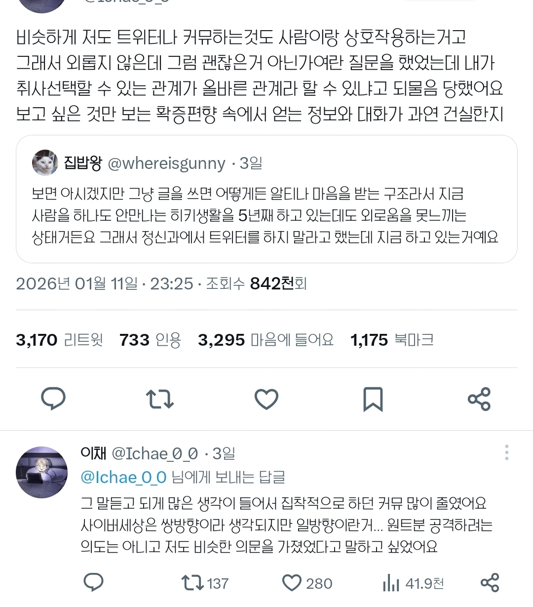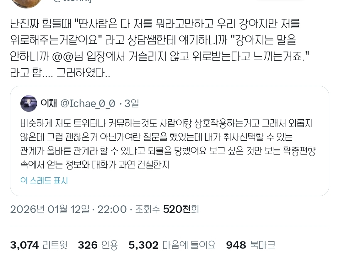 작성자R=VD 로또1등당첨자 작성시간 26.01.15 완전 초기 인터넷처럼 닉넴 달고 주기적으로 계속 1:1 채팅하고 이런거면 상호작용이지만 글 올리고 댓글달고 이런건 걍 1회성일뿐이라 그닥 건강한 소통방식은 아닌듯