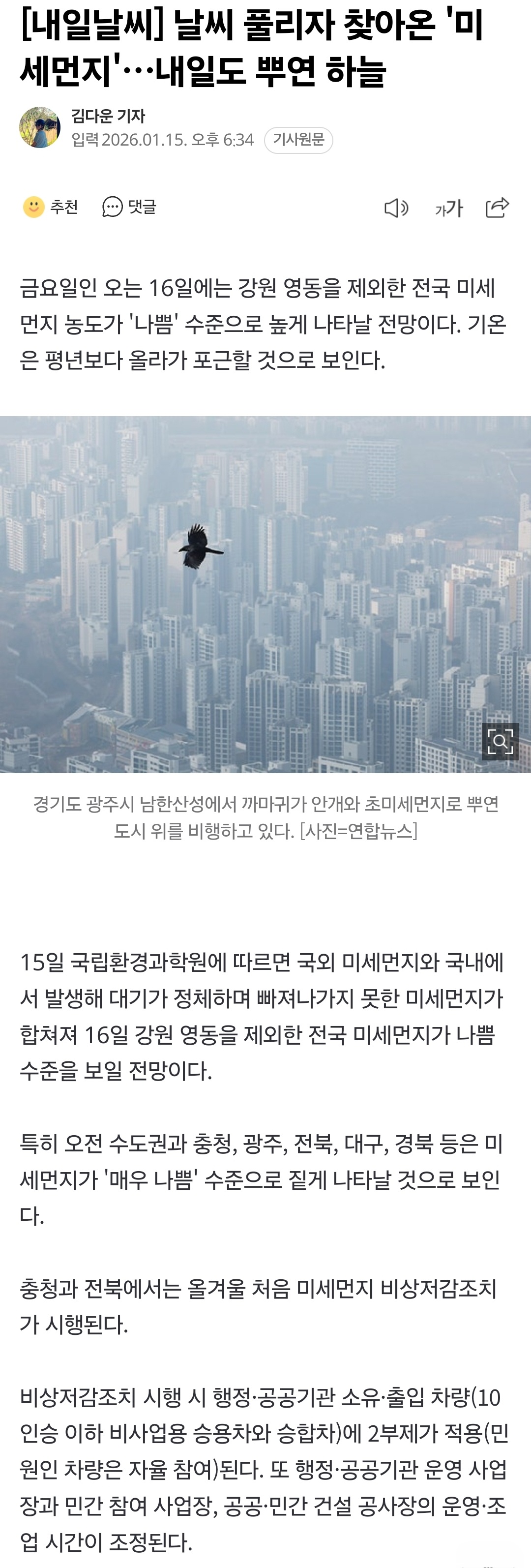 [여시뉴스데스크][내일날씨] 날씨 풀리자 찾아온 '미세먼지'…내일도 뿌연 하늘 작성자올해는나의것|작성시간26.01.15|조회수3,604 목록 댓글 2 글자크기 작게가 글자크기 크게가 출처: https://n.news.naver.com/article/031/0000997358?sid=103 ... 전문은 출처로.. 다음검색 현재 게시글 추가 기능 열기 북마크 공유하기 신고 센터로 신고 댓글 댓글 2 댓글쓰기 답글쓰기 댓글 리스트 작성자보리차한잔 | 작성시간 26.01.15 오늘 진짜 겁나 뿌옇더라 작성자대애애충살자 | 작성시간 26.01.15 존나시러 ㅠㅠ 차라리 추운 게 나아 댓글 전체보기