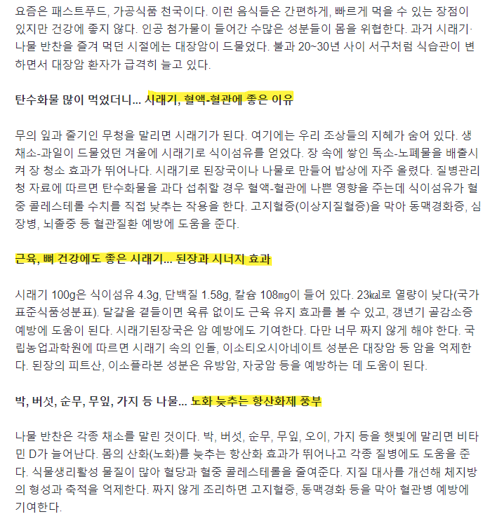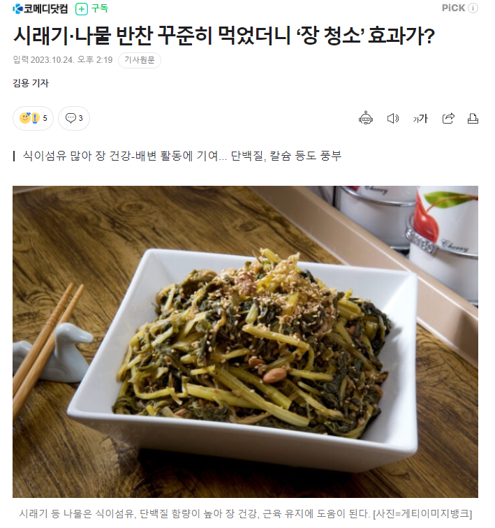 [스크랩] [흥미돋]시래기·나물 반찬 꾸준히 먹었더니 ‘장 청소’ 효과가? 작성자구스허니|작성시간26.01.15|조회수7,373 목록 댓글 6 글자크기 작게가 글자크기 크게가 출처 : https://n.news.naver.com/mnews/article/296/0000070746?sid=103 시래기·나물 반찬 꾸준히 먹었더니 ‘장 청소’ 효과가?요즘은 패스트푸드, 가공식품 천국이다. 이런 음식들은 간편하게, 빠르게 먹을 수 있는 장점이 있지만 건강에 좋지 않다. 인공 첨가물이 들어간 수많은 성분들이 몸을 위협한다. 과거 시래기·나n.news.naver.com " 시래기가 장청소에 좋다고.... " " 개이득! " 다음검색 스크랩 원문 : *여성시대* 차분한 20대들의 알흠다운 공간 현재 게시글 추가 기능 열기 북마크 공유하기 신고 센터로 신고 댓글 댓글 6 댓글쓰기 답글쓰기 댓글 리스트 작성자WoodWick | 작성시간 26.01.15 시래기 된장국 좋아하는데 개이득 작성자도로위의무법자 | 작성시간 26.01.15 맛있겠다 작성자예에니 | 작성시간 26.01.15 시래기 들깨나물 존맛 작성자madison | 작성시간 26.01.16 시래기먹으몀 화장실 직빵임 작성자너구리겨드랑이 | 작성시간 26.01.16 와 요새 저녁마다 나물반찬 먹는데 화장실 갈 때마다 존나 쾌변 ㅠㅠ 댓글 전체보기