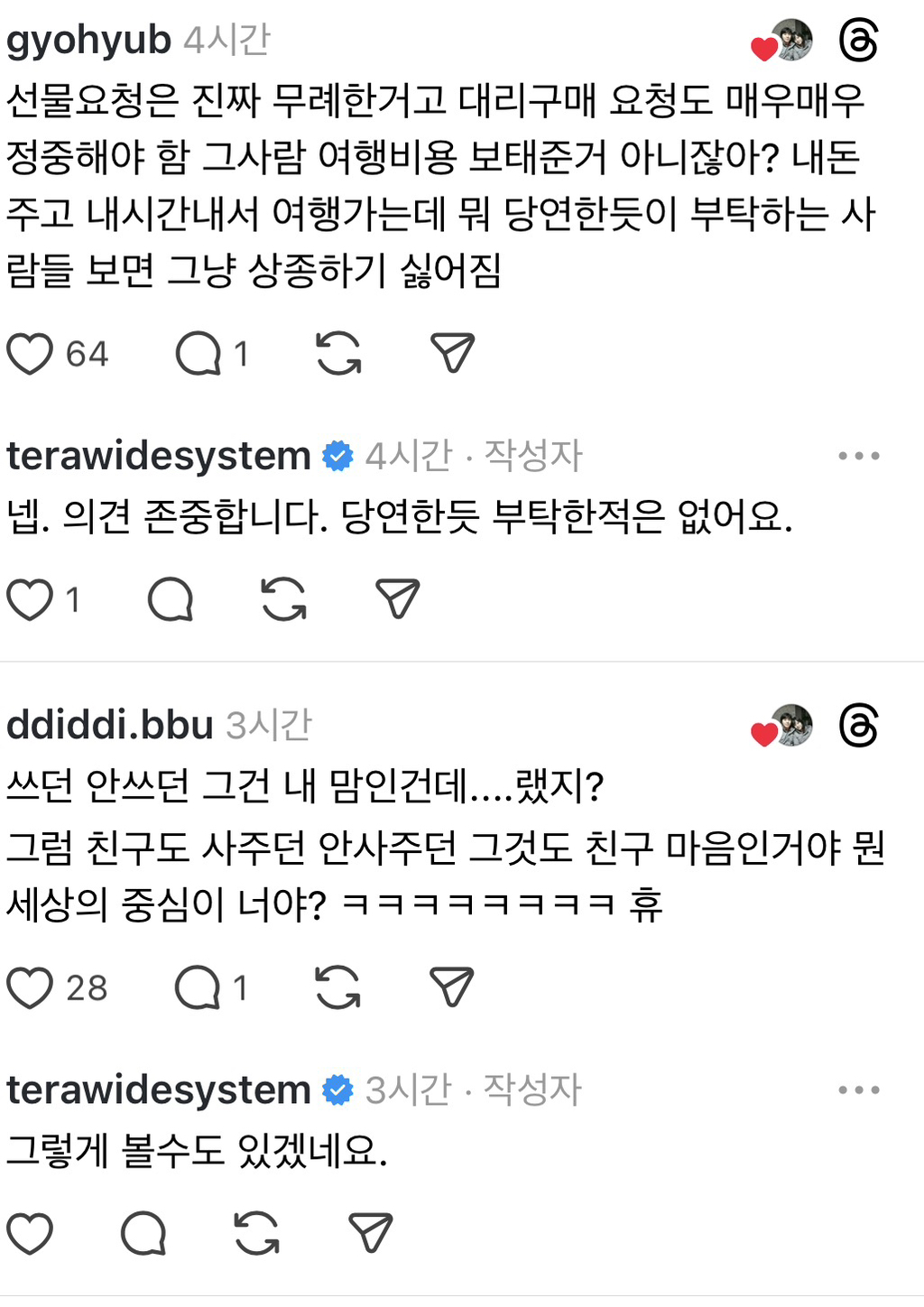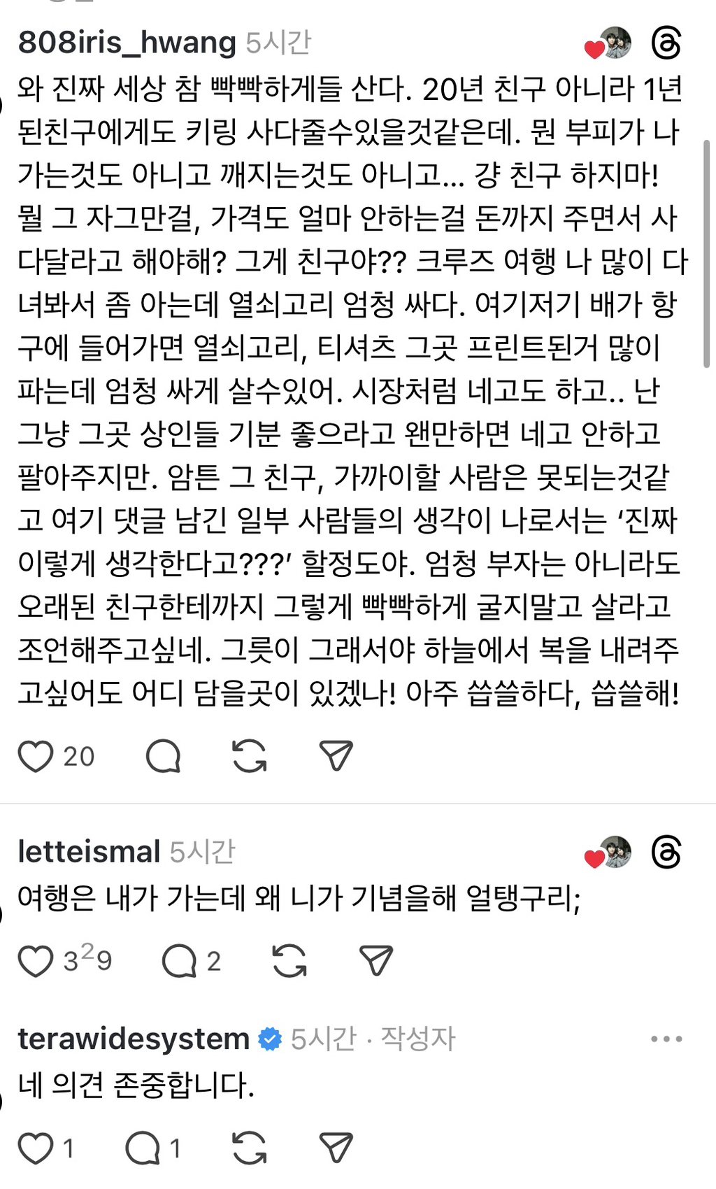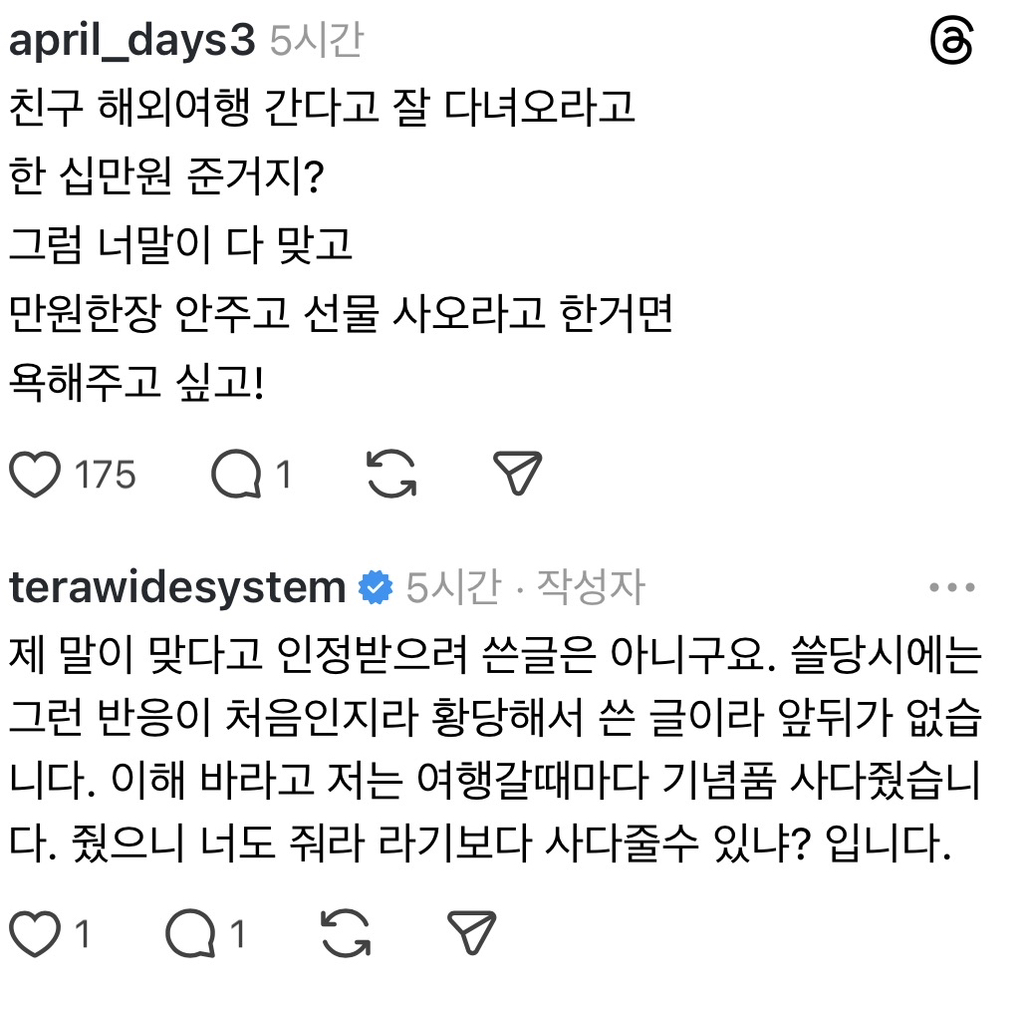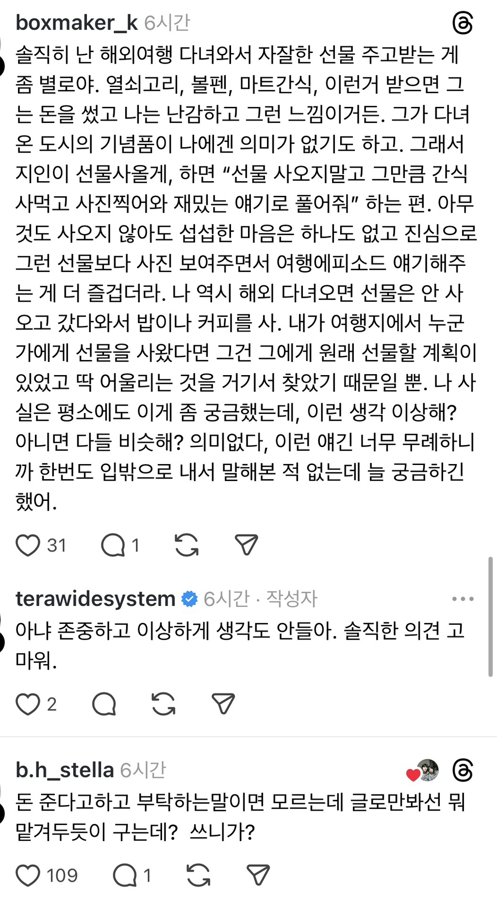 근데 적어도 내주변 데이터로 볼께 여행갈때 꼭 뭐 사다달라는애들은 지들 여행갈땐 하나도 선물 안하는애들이 더 여행지 선물타령함