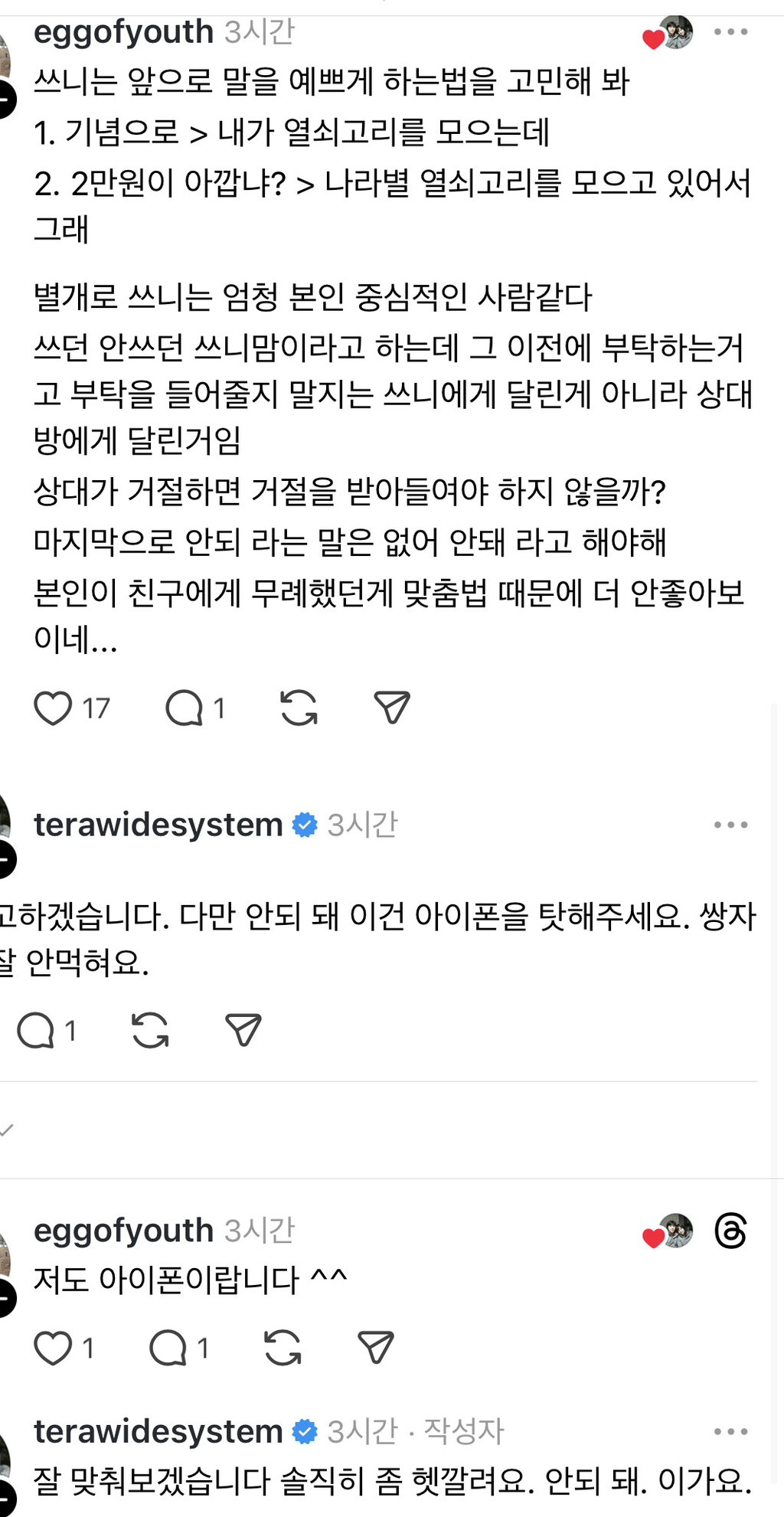작성시간 26.01.21 사달라고 말은 할 수 있지 갖고싶을 수 있을 것 같아 근데 싫으면 싫다하면 되잖아