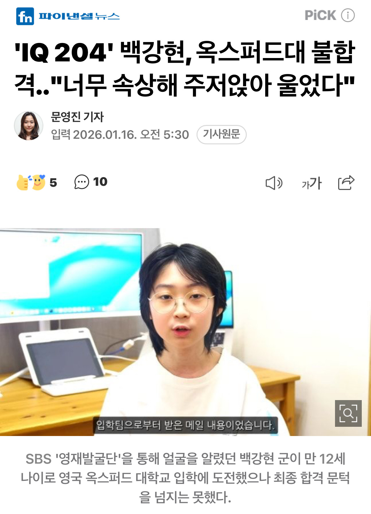 SBS '영재발굴단'에 출연했던 'IQ 204' 백강현군이 만 12세에 옥스퍼드대 컴퓨터과학과 입학에 도전했지만 아쉽게도 불합격했다고 전했다.