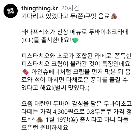 작성자실비김치김치찌개 작성시간 26.01.17 카다이프는 안들어간건가? 그래도 바나프레소 피스타치오라떼 맛있으니 이것도 맛있을듯