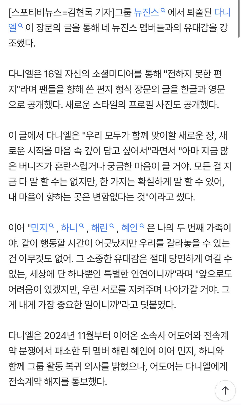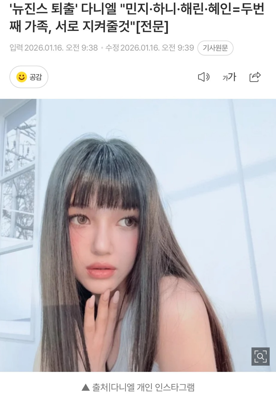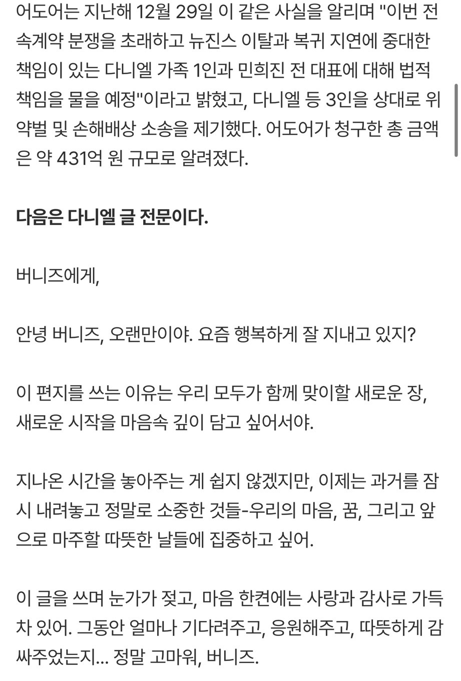 [흥미돋]'뉴진스 퇴출' 다니엘 "민지·하니·해린·혜인=두번째 가족, 서로 지켜줄것"[전문] 작성자고참꿀맛이구마|작성시간26.01.16|조회수53,879 목록 댓글 68 글자크기 작게가 글자크기 크게가 출처: 여성시대 (고참꿀맛이구마)원문: https://m.entertain.naver.com/home/article/477/0000589168'뉴진스 퇴출' 다니엘 "민지·하니·해린·혜인=두번째 가족, 서로 지켜줄것"[전문]여기를 눌러 링크를 확인하세요m.entertain.naver.com 다음검색 현재 게시글 추가 기능 열기 북마크 공유하기 신고 센터로 신고 댓글 댓글 68 댓글쓰기 답글쓰기 댓글 리스트 작성자레사는 염소 | 작성시간 26.01.16 화이팅 다니엘 작성자제티우유 | 작성시간 26.01.16 아 진짜 너무 아쉽다........뉴진스 화이팅 ㅜㅜ 작성자zZzzara | 작성시간 26.01.16 뉴진스 무대 그립다..진짜 맘아퍼 작성자제일 좋은 어느날의 데자뷰 | 작성시간 26.01.16 다니엘 진짜 계속 응원해 작성자이드리히 | 작성시간 26.01.23 다니엘 늘 응원해악플에 상처받지 말길응원하는 사람들이 더 많으니까! 댓글 전체보기