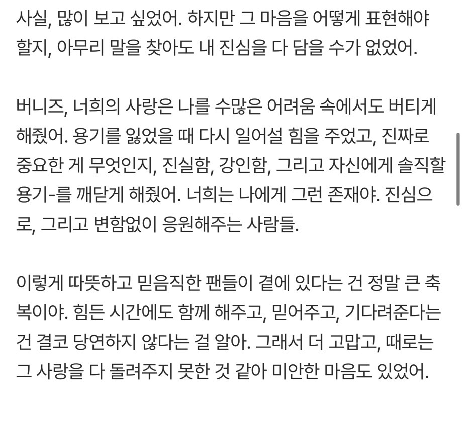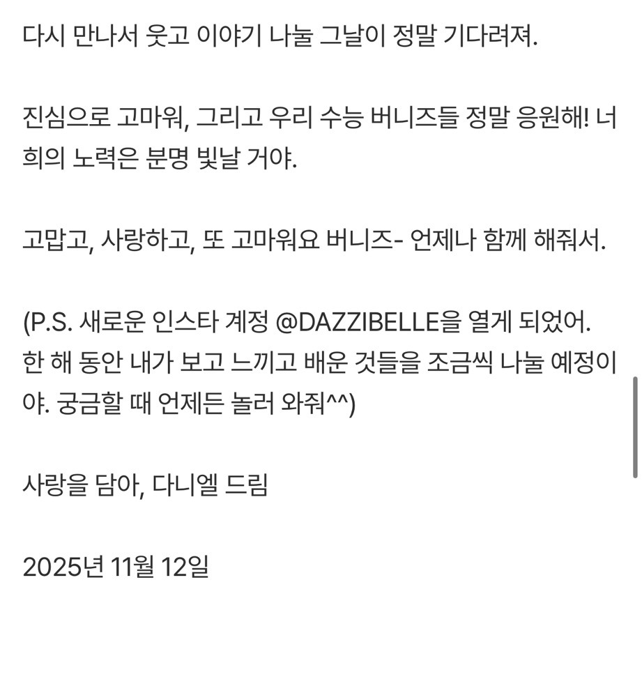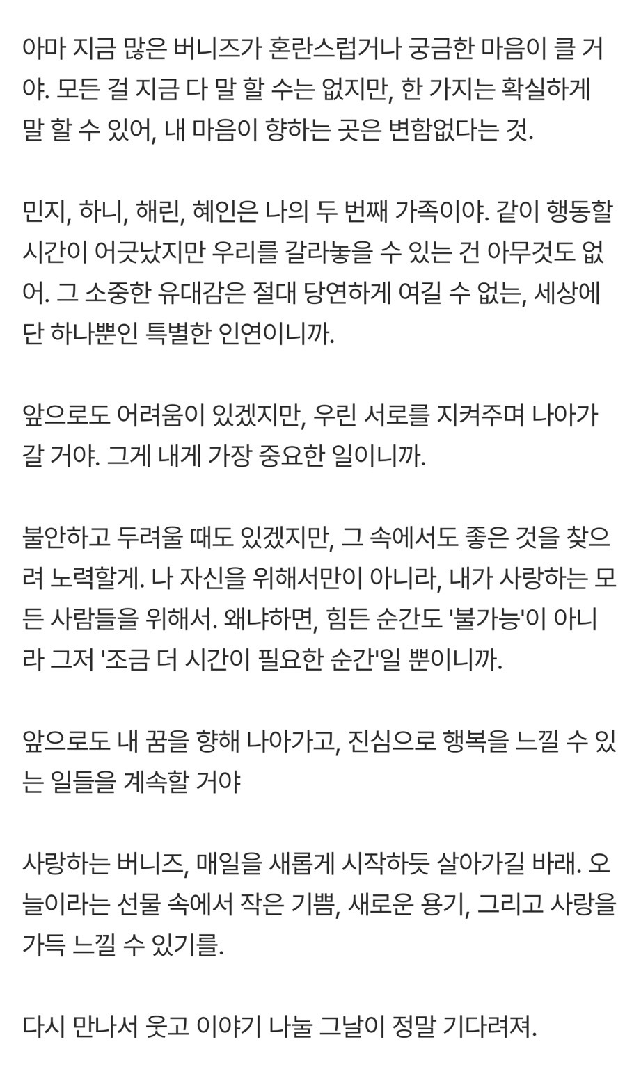 [흥미돋]'뉴진스 퇴출' 다니엘 "민지·하니·해린·혜인=두번째 가족, 서로 지켜줄것"[전문] 작성자고참꿀맛이구마|작성시간26.01.16|조회수53,879 목록 댓글 68 글자크기 작게가 글자크기 크게가 출처: 여성시대 (고참꿀맛이구마)원문: https://m.entertain.naver.com/home/article/477/0000589168'뉴진스 퇴출' 다니엘 "민지·하니·해린·혜인=두번째 가족, 서로 지켜줄것"[전문]여기를 눌러 링크를 확인하세요m.entertain.naver.com 다음검색 현재 게시글 추가 기능 열기 북마크 공유하기 신고 센터로 신고 댓글 댓글 68 댓글쓰기 답글쓰기 댓글 리스트 작성자레사는 염소 | 작성시간 26.01.16 화이팅 다니엘 작성자제티우유 | 작성시간 26.01.16 아 진짜 너무 아쉽다........뉴진스 화이팅 ㅜㅜ 작성자zZzzara | 작성시간 26.01.16 뉴진스 무대 그립다..진짜 맘아퍼 작성자제일 좋은 어느날의 데자뷰 | 작성시간 26.01.16 다니엘 진짜 계속 응원해 작성자이드리히 | 작성시간 26.01.23 다니엘 늘 응원해악플에 상처받지 말길응원하는 사람들이 더 많으니까! 댓글 전체보기