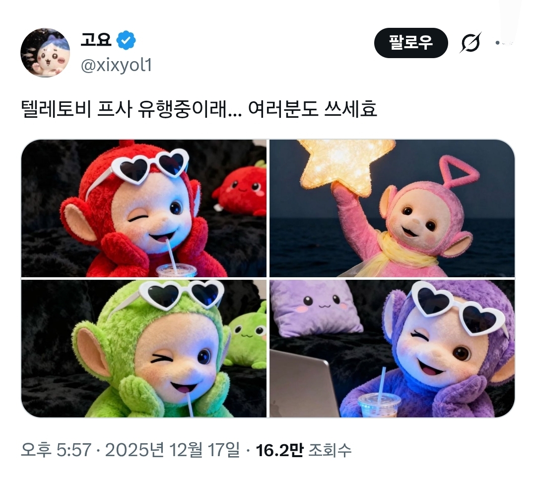 [스크랩] [흥미돋]텔레토비 프사 유행중이래 작성자웃음할당량|작성시간26.01.16|조회수39,347 목록 댓글 69 글자크기 작게가 글자크기 크게가 출처: https://x.com/xixyol1/status/2001215206374994171?s=20 다음검색 스크랩 원문 : *여성시대* 차분한 20대들의 알흠다운 공간 현재 게시글 추가 기능 열기 북마크 공유하기 신고 센터로 신고 댓글 댓글 69 댓글쓰기 답글쓰기 댓글 리스트 작성자English | 작성시간 26.01.16 물고기 보는 뽀 없냐규ㅠ 작성자부산 북구 보안관 | 작성시간 26.01.16 왜 나나 없냐구요 ㅜㅜ 작성자imnayeon | 작성시간 26.01.16 뽀 졸귀 작성자김돗돔여시 | 작성시간 26.01.16 분홍색은 누구야? 머리모양봐서는 보라돌이같은데 작성자압제를 불살라라 | 작성시간 26.01.17 귀여워 댓글 전체보기