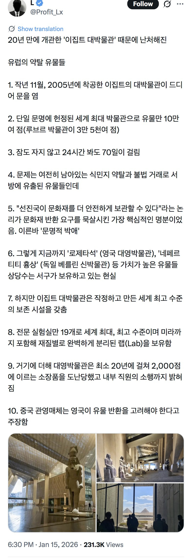 이집트가 진짜 이를 악물고 저 박물관 지을 때 설마 짓겠냐했다던데 이젠 장물 돌려주지 그래