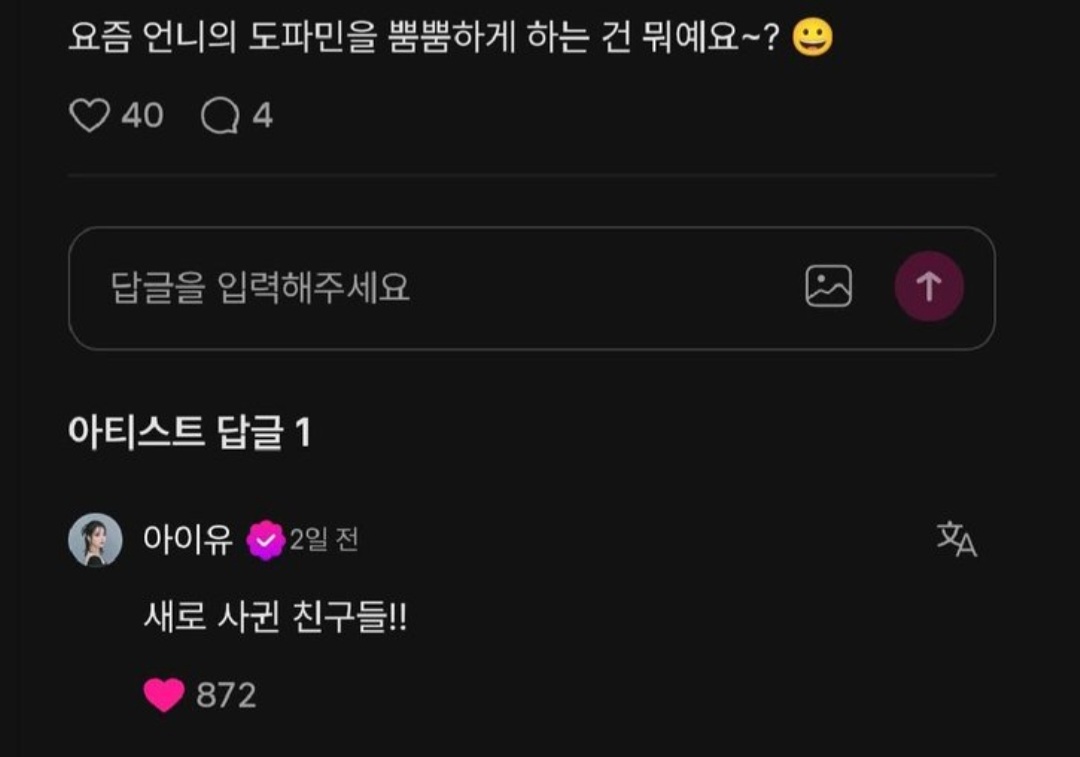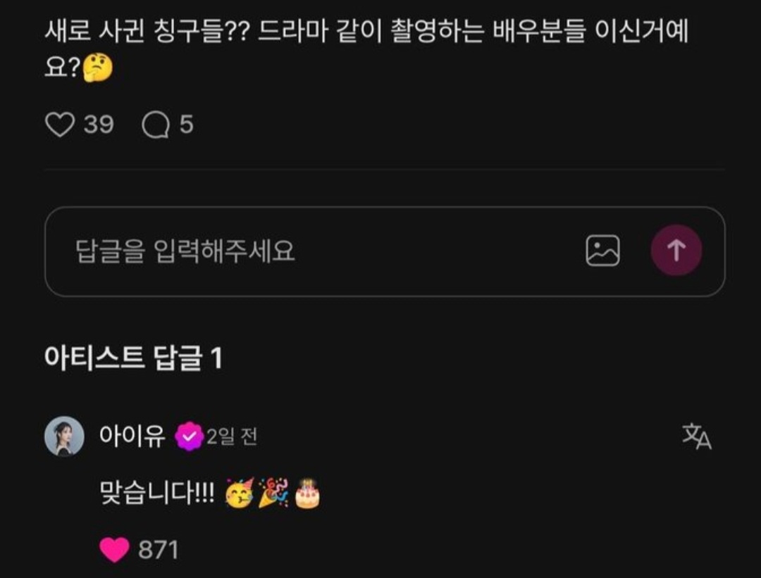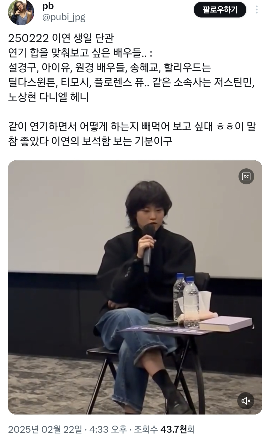 [흥미돋]아이유가 드라마 <21세기 대군부인> 찍으면서 생긴 새 친구.twt 작성자스피또띠아|작성시간26.01.16|조회수35,934 목록 댓글 45 글자크기 작게가 글자크기 크게가 출처: 여성시대 스피또띠아배우 이연극중 재벌가 경영인인 아이유의 수석비서 역할이라서붙어있는 신 엄청 많았을 듯그리고 글 쓰느라 트위터 서치하다가 발견했는데이연이 작년 초에 같이 연기하고싶은 배우에 아이유 언급했었음반년만에 바로 이뤄진 소원 다음검색 현재 게시글 추가 기능 열기 북마크 공유하기 신고 센터로 신고 댓글 댓글 45 댓글쓰기 답글쓰기 댓글 리스트 답댓글 작성자ㅇㅁㅇㅇㄷ | 작성시간 26.01.17 메종마르지엘라 답댓글 작성자비좀적당히와라 | 작성시간 26.01.17 ㅇㅁㅇㅇㄷ 오 고마워 찾아봐야겠다 어제 하루종일 찾다가 포기했거든ㅠㅠ 작성자뿡뿡헴 | 작성시간 26.01.17 연예인들 나이먹어도 친구 사귈 환경 많은거 부럽다ㅜㅠ 작성자걍생고고 | 작성시간 26.01.17 이연 너무 좋아ㅠ 작성자나는 먹보다 | 작성시간 26.01.29 이연 성격 좋던데 잘 웃고 리액션 잘하고 댓글 전체보기