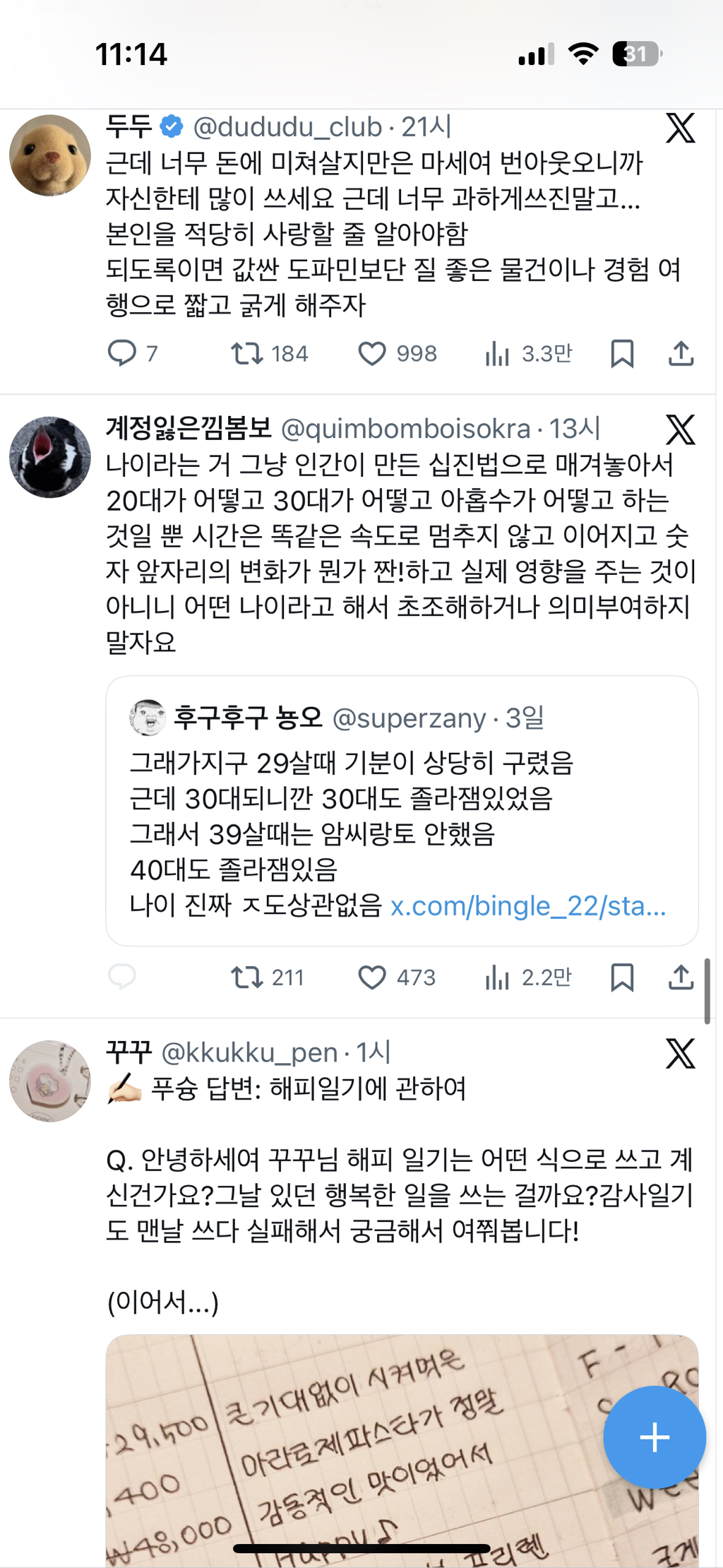 [스크랩] [흥미돋]23.9살인데 이거 좋다 작성자사천짜파게티먹을거임|작성시간26.01.16|조회수8,835 목록 댓글 2 글자크기 작게가 글자크기 크게가 그냥 나이정병 탈출하자 다음검색 스크랩 원문 : *여성시대* 차분한 20대들의 알흠다운 공간 현재 게시글 추가 기능 열기 북마크 공유하기 신고 센터로 신고 댓글 댓글 2 댓글쓰기 답글쓰기 댓글 리스트 작성자INVU | 작성시간 26.01.16 맞다 시간도 나이도 다 인간이 임의적으로 정해놓은것일뿐... 작성자그산이정말거기있었을까 | 작성시간 26.01.16 맞아.. 지구가 한 바퀴 돌았는데 머 어쩌라고…. 나 토성에선 1살이야……., 응애 댓글 전체보기