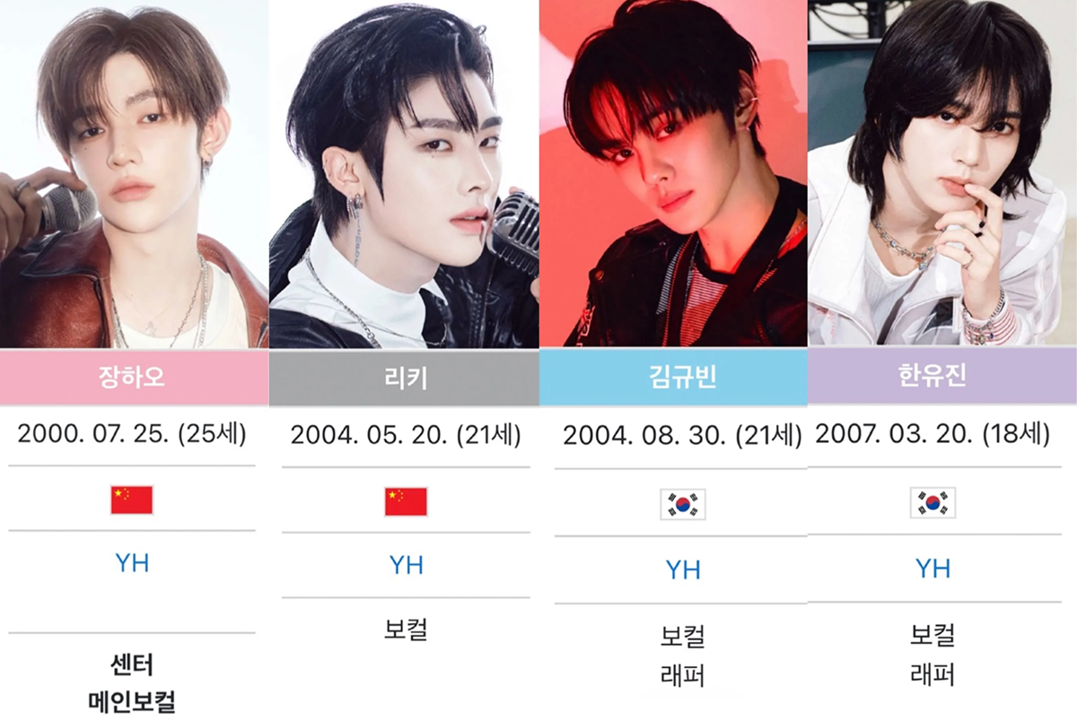 제로베이스원 위에화 소속인 장하오, 리키, 김규빈, 한유진