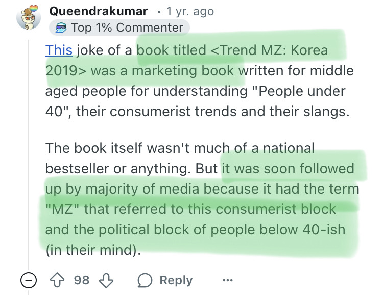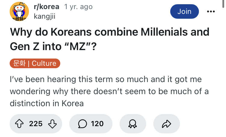 출처: https://www.reddit.com/r/korea/comments/1chdn0k/why_do_koreans_combine_millenials_and_gen_z_into/?rdt=39566