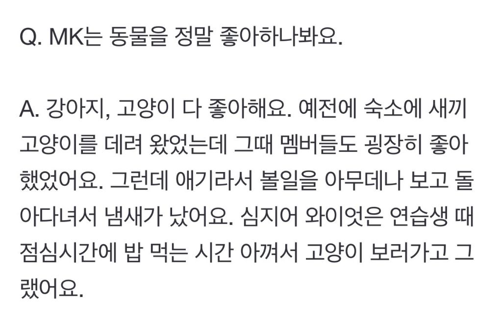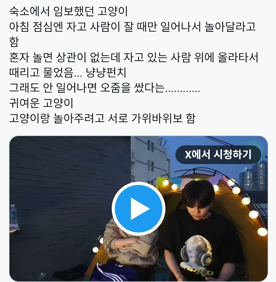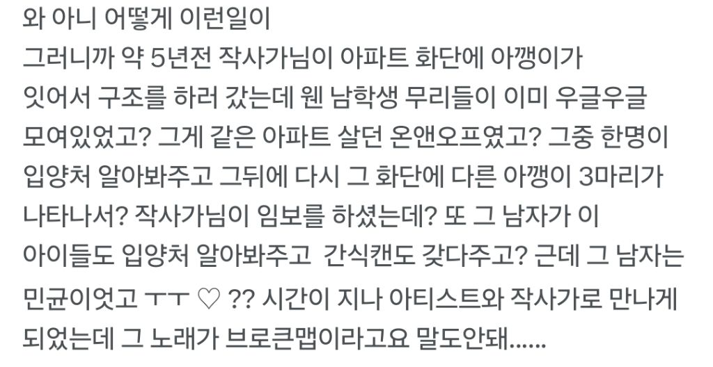 사실 처음에 모여있을 때 아파트에서 그런 남학생 무리(?를 처음 봐서 혹시 고양이를 괴롭히는 건 아닌가 하고 두 주먹 불끈 쥐고 갔는데, 고양이 상태 보는 내내 옆에서 멤버분들이 ‘좋은 묘생이란 뭘까..’하는 웃음기 1도 없는 진지한 토론을 하고 계셔서 편견 가득했던 제 주먹만 머쓱했던 기억이 있고요. (아니 근데 같은 아파트에 아이돌이 산다고 생각할 리없잖아요? ㅠ)