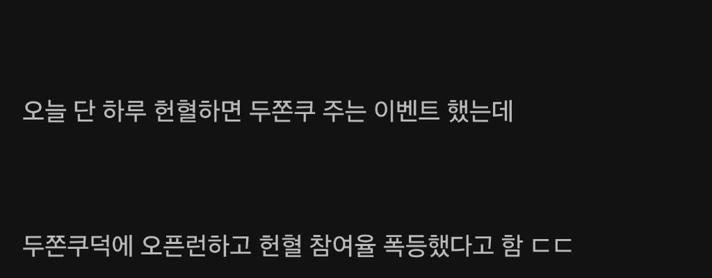 [스크랩] [흥미돋]헌혈하면 두쫀쿠 준다니까 오픈런한 2030 청년들 ㄷㄷㄷㄷ 작성자푸크린|작성시간26.01.16|조회수81,776 목록 댓글 227 글자크기 작게가 글자크기 크게가 다음검색 스크랩 원문 : 도탁스 (DOTAX) 현재 게시글 추가 기능 열기 북마크 공유하기 신고 센터로 신고 댓글 댓글 227 댓글쓰기 답글쓰기 댓글 리스트 작성자AM0300 | 작성시간 26.01.19 ㅇㅋㅋㅋㅋㅋㅋㅋㅋㅋㅋ 작성자아련댕댕이 | 작성시간 26.01.19 개웃긴다 ㅋㅋㅋㅋㅋㅋㅋㅋㅋㅋㅋ 작성자나가시는문은저쪽입니다 | 작성시간 26.01.19 이러면 피가 남아돌지 작성자상식적인 개10갑부 | 작성시간 26.01.20 귀여워ㅠㅠㅠ사람들기획 잘 했다 작성자눈을감고내가하는이야길잘들어봐 | 작성시간 26.01.20 잘햇닼ㅋㅋㅋㅋ 댓글 전체보기