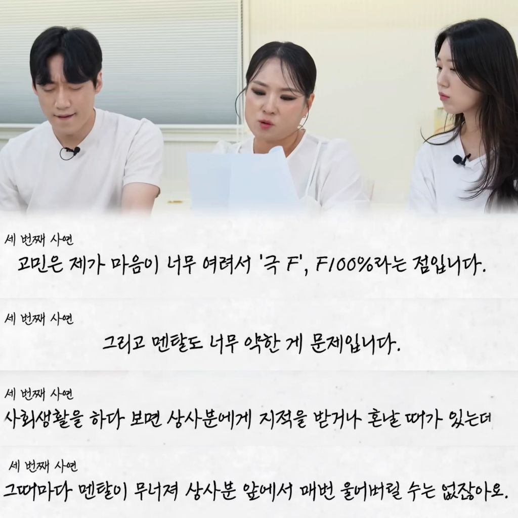 나도극F이고 멘탈약한데 본인이 뼈저리게 느끼는게 그저 답이다 울어도 절대 해결되지않고 공감해주지 않는다 이걸 몸의 세포가 기억하면 그땐 안울어 내심 기대치가 있고 우는게 무기라는게 무의식에 있으니 우는것임 -