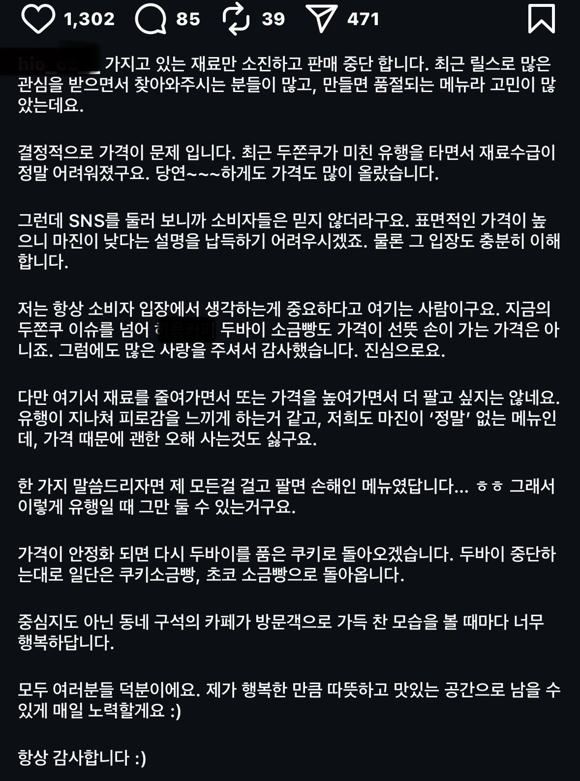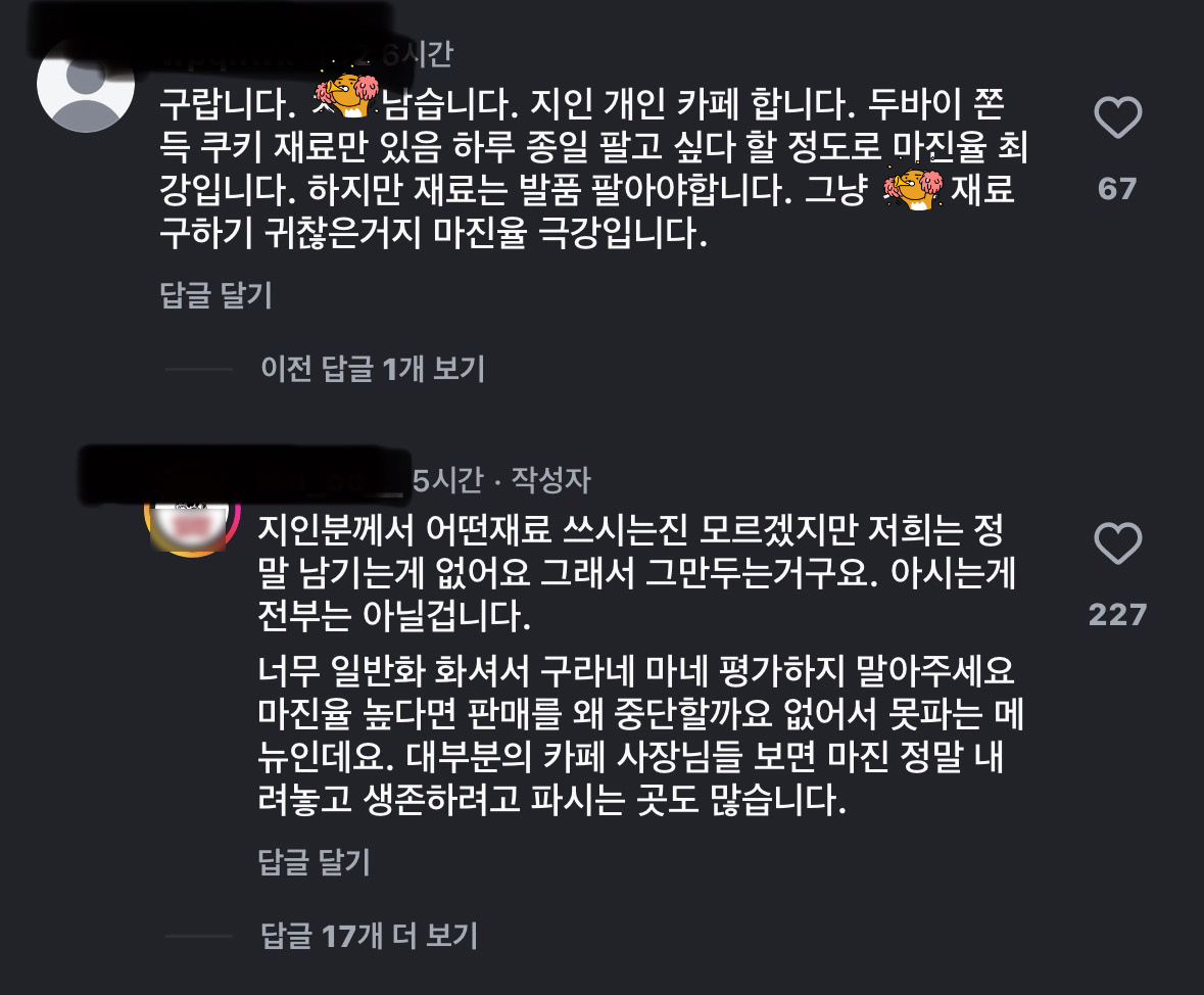 [흥미돋]두바이 디저트 팔수록 손해라 판매 중단한다는 사장님.jpg 작성자flflf|작성시간26.01.17|조회수148,283 목록 댓글 245 글자크기 작게가 글자크기 크게가 출처: https://theqoo.net/square/4052795736 다음검색 현재 게시글 추가 기능 열기 북마크 공유하기 신고 센터로 신고 댓글 댓글 245 댓글쓰기 답글쓰기 댓글 리스트 작성자손풍기발명가 | 작성시간 26.01.20 긍데 ㄹㅇ 이건 다들 그만사야할듯 재료 가격 개올랐어 ㅡㅡ 작성자마라탕10단계 | 작성시간 26.01.20 그면 제품 가격을더올리면 안돼? 작성자뿅뿅하다뿅뿅한 | 작성시간 26.01.21 자기 카페도 아니고 지인이 사장인데 어쩌구 하면서 구라 운운하는 사람은 뭐임 작성자미스트시원래 | 작성시간 26.01.25 가격 착해지면 내려서 파는거면 인정 작성자테토냠 | 작성시간 26.01.25 이때다 싶어서 사악하게 금액 올리는 유통업자들 사라져라 댓글 전체보기