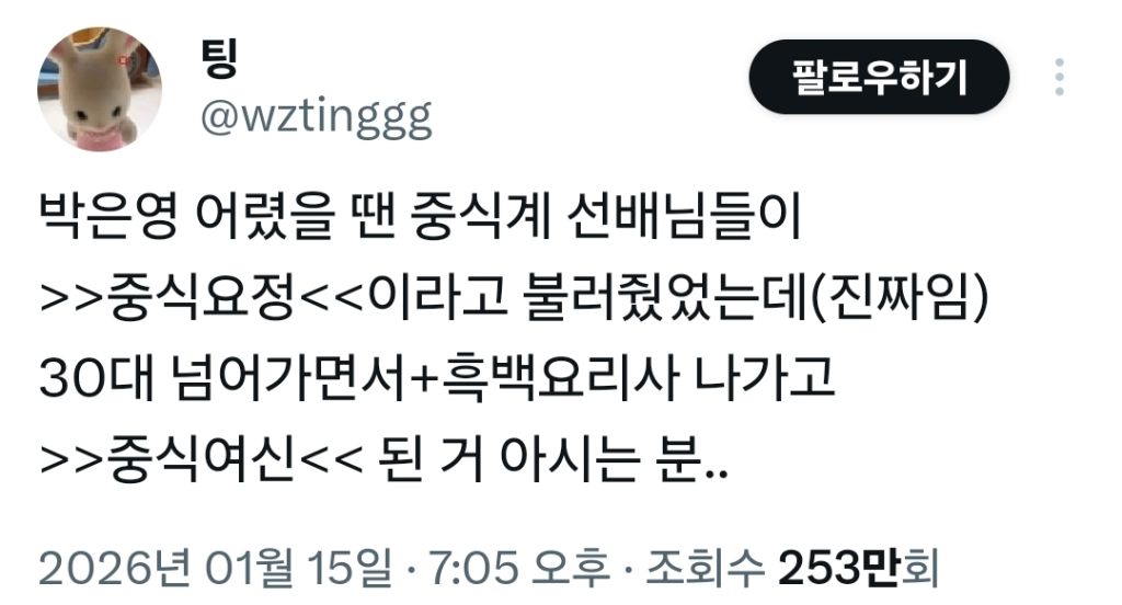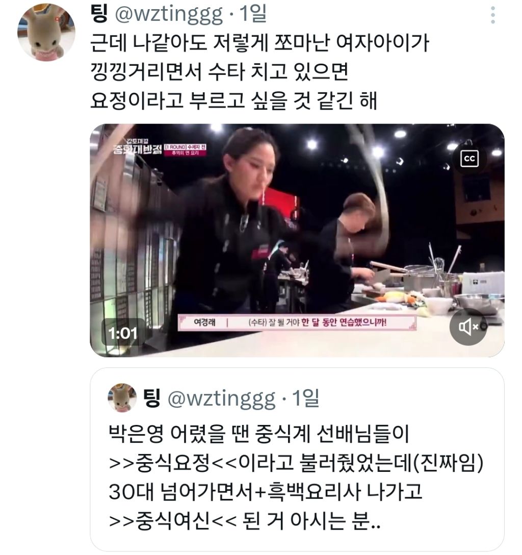 작성자아이돌호사가 작성시간 26.01.17 저거 영상 보면 이연복도 박은영 수타치는 거 보다가 여경래한테 가서 같이 걱정하는 거 진짜 중식요정 중식딸램 그자체