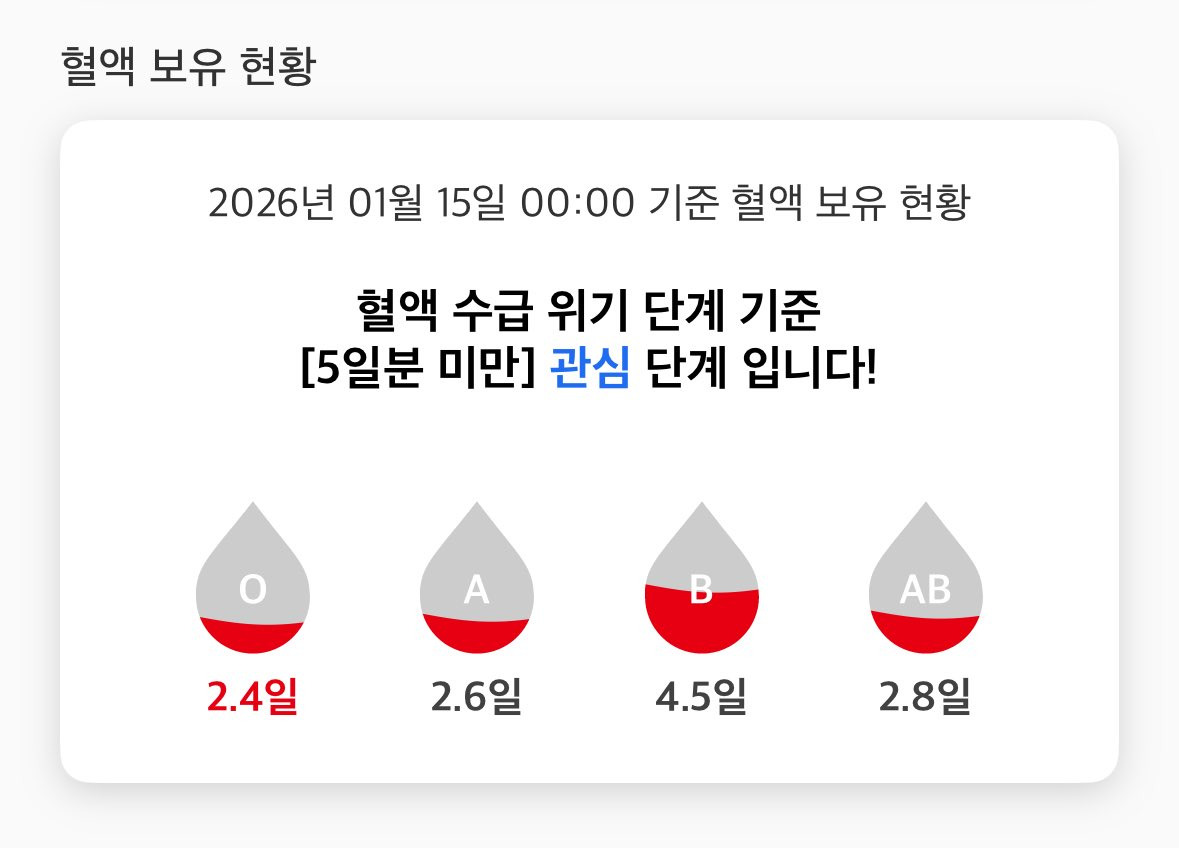 +)현재 대한적십자사에서 공개한 혈액 보유 현황에 따르면 혈액형별 보유량이 5일도 채 안되고 있어 관심이 많이 필요한 상황임
