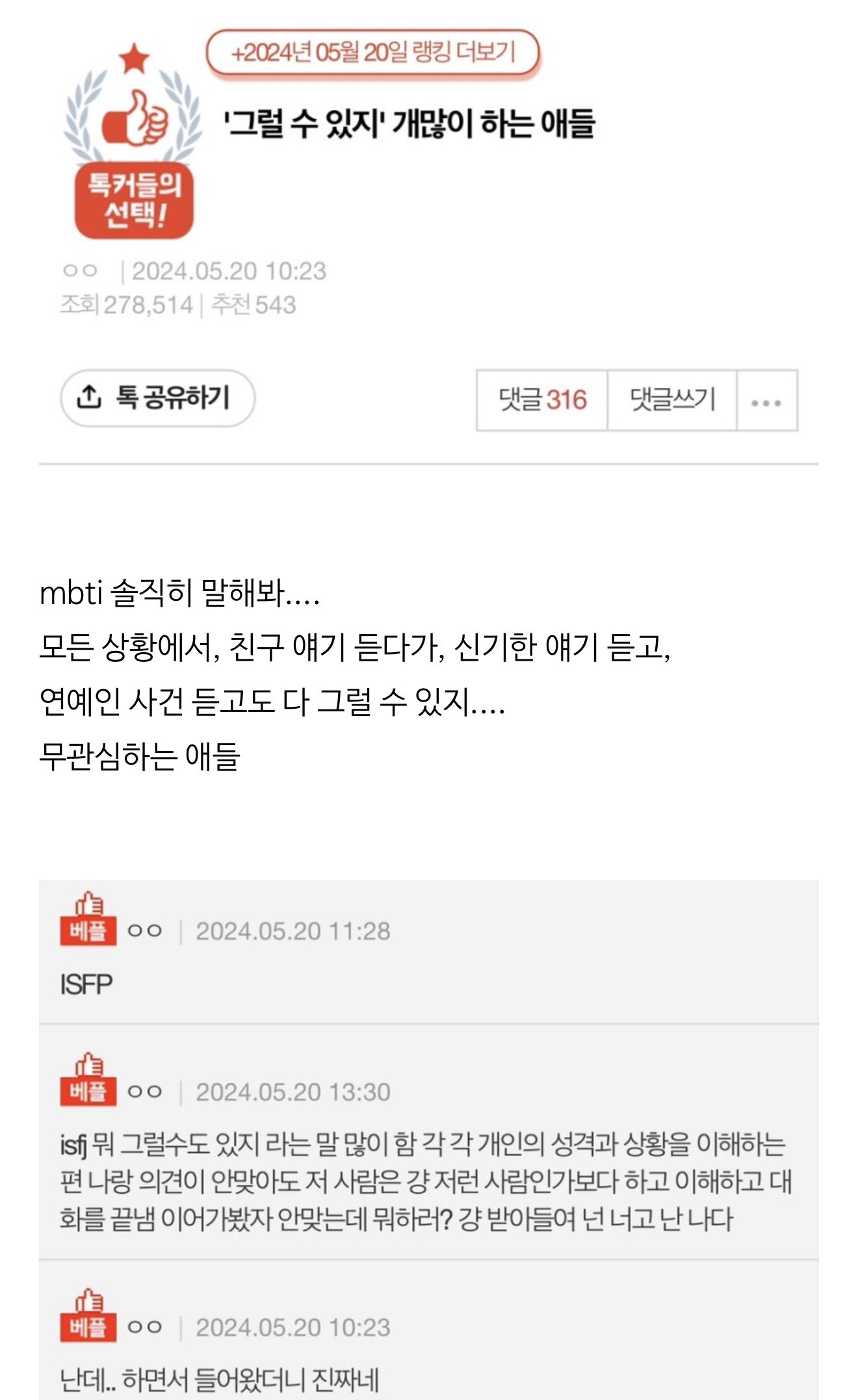 작성자뭉그러진과일 작성시간 26.01.20 isfp 그 사람 입장에선 그렇게 생각/행동했을 수 있겠다임 내 일 아니니까 판단 보류 존중의 의미