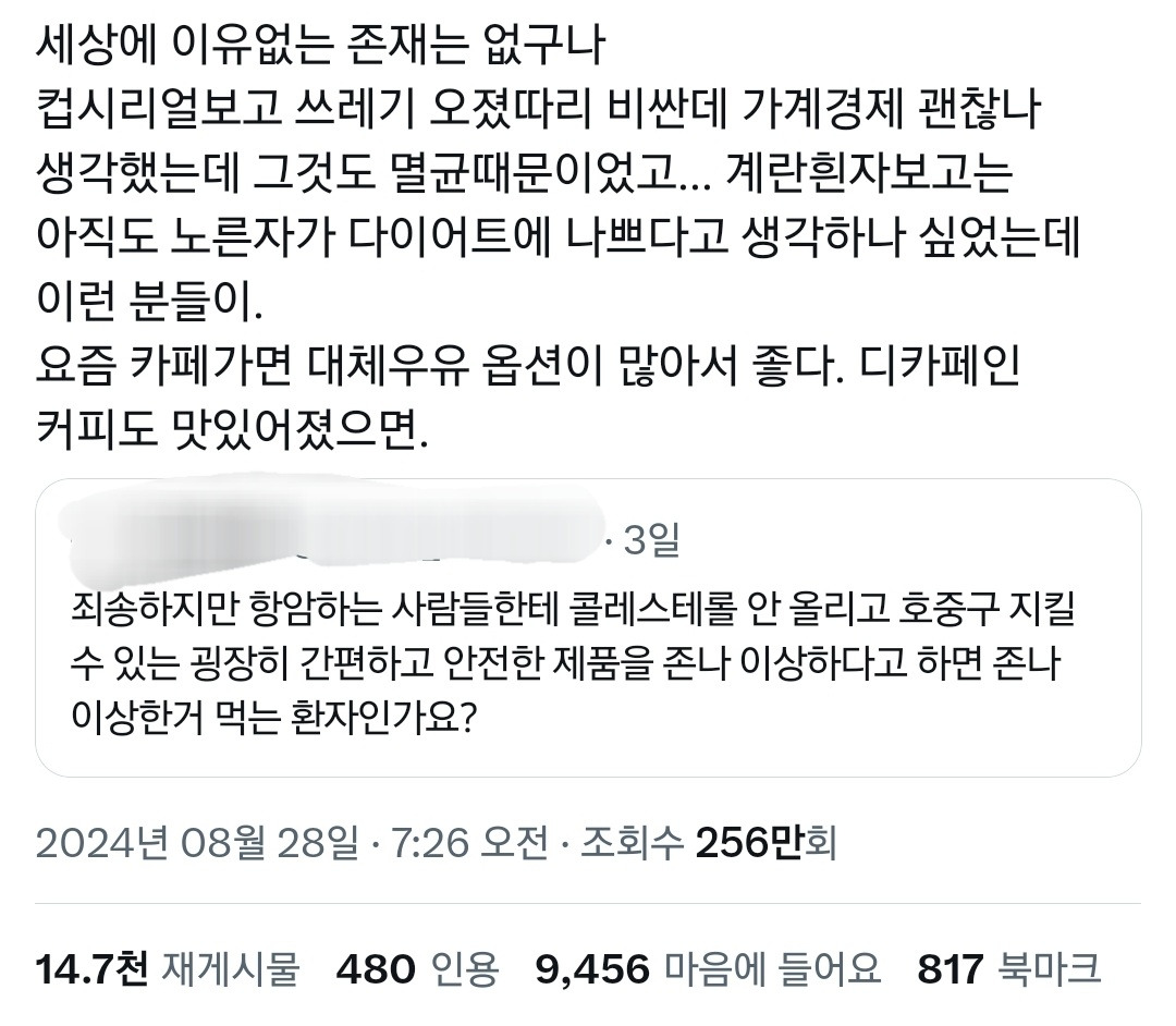 콜레스테롤 수치 높게떠서 요즘 신경쓰는 중이었는데 삶은 계란 먹을 때마다 노른자 빼니까 사람들이 한마디씩 하는거 신경쓰였거든 ㅠ