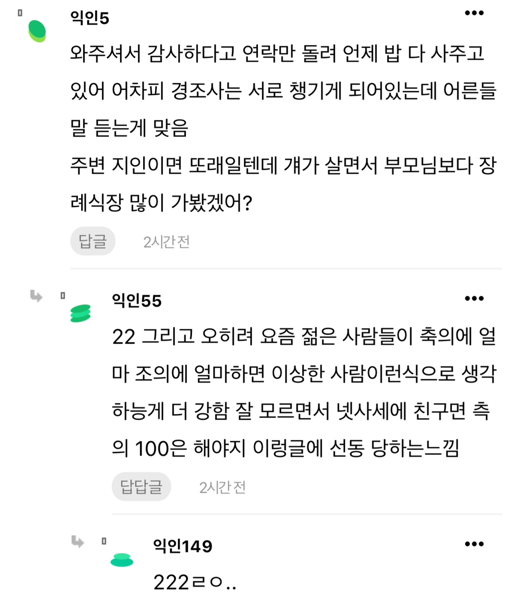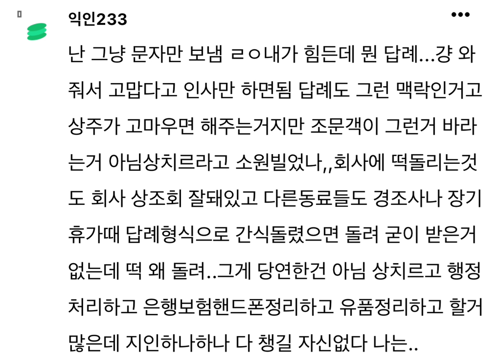 작성자파키리노진사우루스 작성시간 26.01.25 별 이상한 문화가 생겼네 슬픔을 추스를 정신도 없는데 답례품 전달이라니 참 살기 피곤해지네