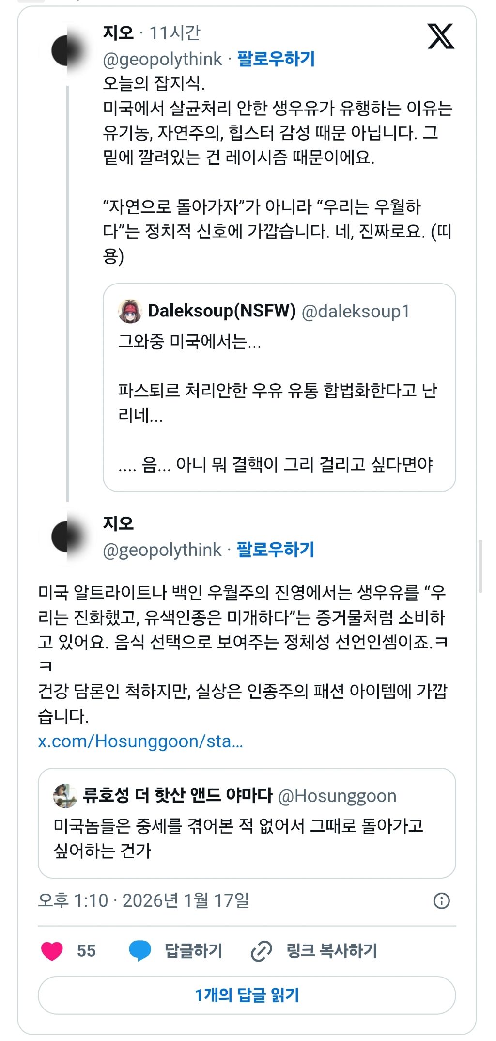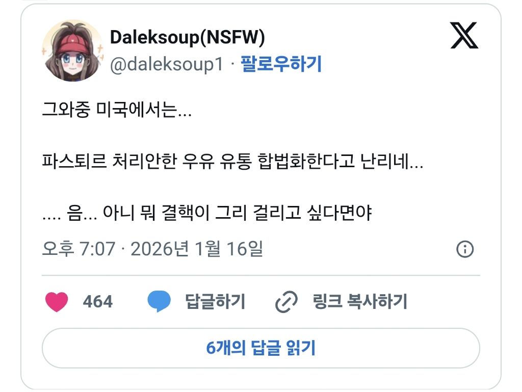 [흥미돋]그와중 미국에서는... 파스퇴르 처리안한 우유 유통 합법화한다고 난리네... 작성자아흐레|작성시간26.01.18|조회수29,502 목록 댓글 170 글자크기 작게가 글자크기 크게가 출처: https://theqoo.net/square/4064725489https://x.com/i/status/2012104411527712920https://x.com/i/status/2012376932373914021 다음검색 현재 게시글 추가 기능 열기 북마크 공유하기 신고 센터로 신고 댓글 댓글 170 댓글쓰기 답글쓰기 댓글 리스트 작성자출근하자마자퇴근시켜달라 | 작성시간 26.01.19 ㅋㅋㅋㅋ많이 마시슈.... 작성자뭐래는겨 | 작성시간 26.01.19 그레 다죽어줘 작성자환장하겟네 | 작성시간 26.01.20 땅콩 먹고 죽는 넘들이 신기하네... 작성자뉴뉴냐냐시계 | 작성시간 26.01.20 와.. 작성자곰브리치야 내 이름 적어둬라 | 작성시간 26.01.29 진짜 와… 댓글 전체보기