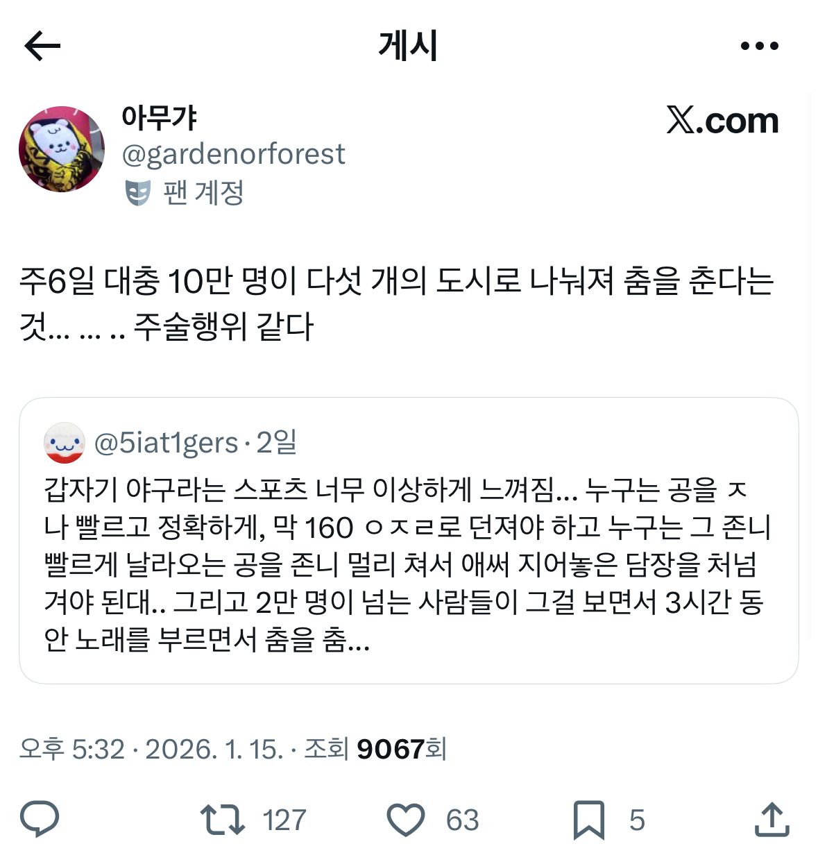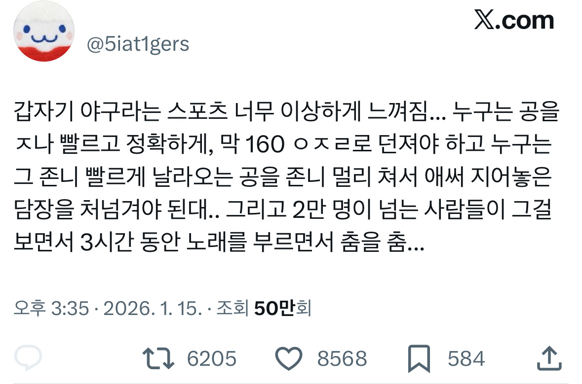 [흥미돋][KBO] 갑자기 야구라는 스포츠 너무 이상하게 느껴짐 작성자자경이친구|작성시간26.01.18|조회수25,657 목록 댓글 17 글자크기 작게가 글자크기 크게가 출처: https://x.com/5iat1gers/status/2011688750108348786?s=20게다가 이제는 그 10만명 안에 들어가기도 빡셈 다음검색 현재 게시글 추가 기능 열기 북마크 공유하기 신고 센터로 신고 댓글 댓글 17 댓글쓰기 답글쓰기 댓글 리스트 작성자함열마 | 작성시간 26.01.18 아 ㅈㄴ웃기네 ㅋㅋㅋㅋㅋㅋㅋㅋㅋㅋㅋㅋㅋㅋㅋ 작성자뜌쬰큐 | 작성시간 26.01.18 또다른 혼문이넼ㅋㅋㅋㅋㅋㅋㅋㅋ 작성자불을찾자 | 작성시간 26.01.18 앜ㅋㅋ 작성자미역미역국 | 작성시간 26.01.18 근데 진짜 야구 룰 누가 만든 걸까 어쩌다 이런 게임을 만든 거냐고 작성자born in blue_ | 작성시간 26.01.19 가끔 좀.. 좀 그냥 근본적으로 이상하다는 생각이 들 때가 있음.. 야구 20년 봤는데 ㅋㅋㅋㅋㅋㅋㅋㅋㅋㅋ 댓글 전체보기