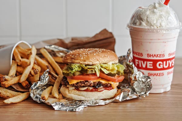 파이브 가이즈는 마치 뒷마당 바비큐 파티에서 먹는 듯한 든든한 버거를 제공합니다. 제가 까다롭게 하나만 꼽자면, "올 더 웨이" — 즉 모든 토핑을 추가한 상태로 주문하면, 구운 양파와 버섯 때문에 버거가 다루기 힘들어집니다. 또한, 이 버거들은 가격이 비쌉니다. 베이컨 치즈 버거(더블 패티)는 $12.99였습니다. 맥도날드에서 더블 치즈 버거 다섯 개를 먹는 것이 더 나을까요? 그 어느 쪽도 이해할 수 있을 것 같습니다.