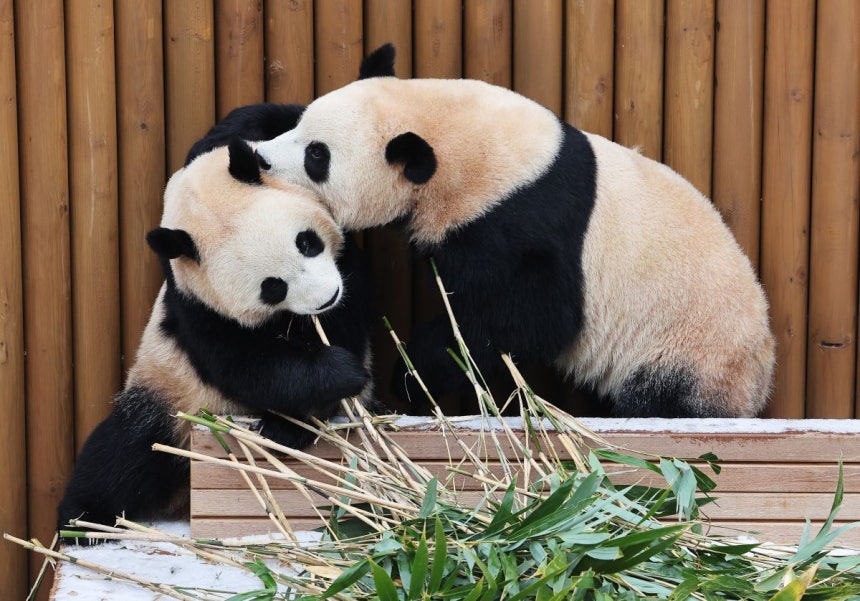 15일 경기도 용인시 에버랜드에서 쌍둥이 판다 루이바오와 후이바오가 눈 위에서 먹이를 먹으며 장난치고 있다.연합뉴스