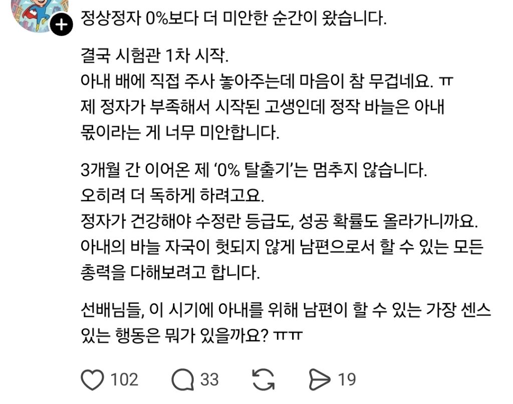 [스크랩] [흥미돋]정상정자 0%인데 시험관을 왜하는데 작성자Hypehype|작성시간26.01.18|조회수45,929 목록 댓글 323 글자크기 작게가 글자크기 크게가 대체 다음검색 스크랩 원문 : *여성시대* 차분한 20대들의 알흠다운 공간 현재 게시글 추가 기능 열기 북마크 공유하기 신고 센터로 신고 댓글 댓글 323 댓글쓰기 답글쓰기 댓글 리스트 답댓글 작성자10.박정아 | 작성시간 26.01.21 헐.. 무정자증 유전자 남겨서 뭐하게 작성자깅아지 | 작성시간 26.01.19 에라이... 작성자모모@ | 작성시간 26.01.19 특이하다...진짜....정상정자가 0%인데 애를 왜 낳으려고 함? 작성자우라헴 | 작성시간 26.01.19 ????? 작성자귀뚜라미귀뚜라미 | 작성시간 26.01.19 제정신이냐 댓글 전체보기
