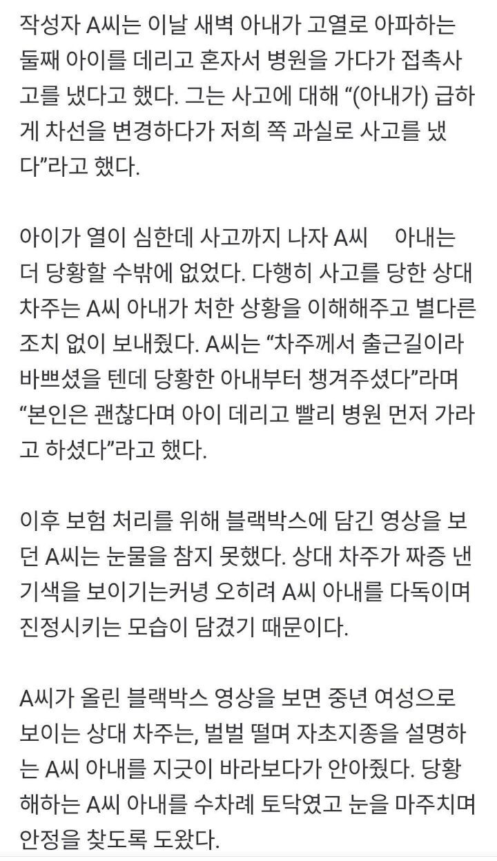 [스크랩] [흥미돋]“아이가 열이 심해요”···급한 마음에 낸 사고, 상대 차주는 안아줬다 작성자#mood|작성시간26.01.18|조회수42,016 목록 댓글 42 글자크기 작게가 글자크기 크게가 출처 : https://n.news.naver.com/article/023/0003651209“아이가 열이 심해요”···급한 마음에 낸 사고, 상대 차주는 안아줬다경기도에서 발생한 한 접촉사고에 얽힌 사연이 알려지며 네티즌들이 눈물을 훔쳤다. 사고를 낸 차주는 고열로 아픈 아이를 병원에 가다가 사고를 냈는데, 상대 차주는 이런 사연을 듣고 “전 괜n.news.naver.com전문 출처로 다음검색 스크랩 원문 : *여성시대* 차분한 20대들의 알흠다운 공간 현재 게시글 추가 기능 열기 북마크 공유하기 신고 센터로 신고 댓글 댓글 42 댓글쓰기 답글쓰기 댓글 리스트 작성자두배짬봉 | 작성시간 26.01.18 엄마 ㅜㅜㅜㅜㅜ 내가 다 눈물날거같아 작성자지구공룡 | 작성시간 26.01.18 존나 슬프다 작성자적당히할생각 | 작성시간 26.01.18 어른... 작성자curens | 작성시간 26.01.18 눈물나ㅠ 작성자Do sth | 작성시간 26.01.19 쓰다듬는 저 손길이 너무 따뜻하다ㅠㅠ 댓글 전체보기