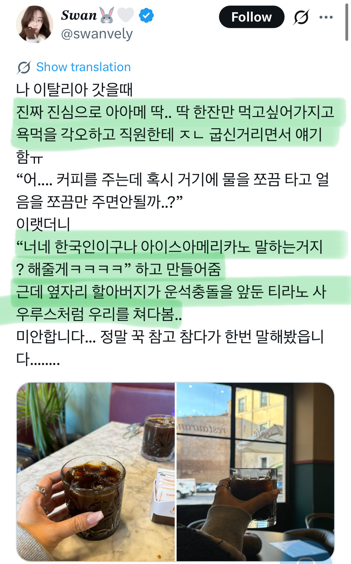 작성시간 26.01.19 ㅋㅋㅋㅋ나도 오스트리아 공항에서 돌아오는 길에 미친듯이 아아가 먹고싶어서 돌아다니다고 한 카페에 가서 무작정 그...아이스 아메리카노를 찾고있는데...라고 말했더니