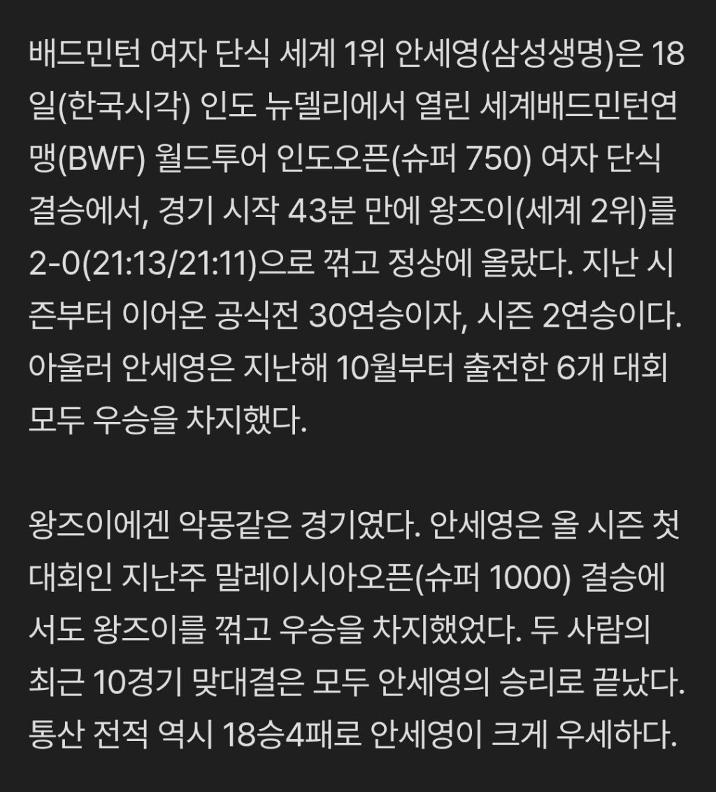 지난해 남녀부 통틀어 단일 시즌 역대 최다 우승 타이(11승) 기록과 역대 최고 승률(94.8%), 그리고 역대 최고 누적 상금(100만3175달러)을 갈아치운 안세영은 올해도 그 기세를 이어가며, 새로운 역사를 써내려가고 있다.