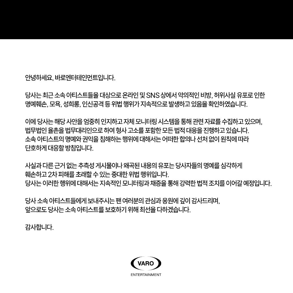 13일 바로엔터테인먼트는 공식 입장문을 통해 "당사는 최근 소속 아티스트들을 대상으로 온라인 및 SNS 상에서 악의적인 비방, 허위사실 유포로 인한 명예훼손, 모욕, 성희롱, 인신공격 등 위법 행위가 지속적으로 발생하고 있음을 확인했다"라는 말로 시작했다.