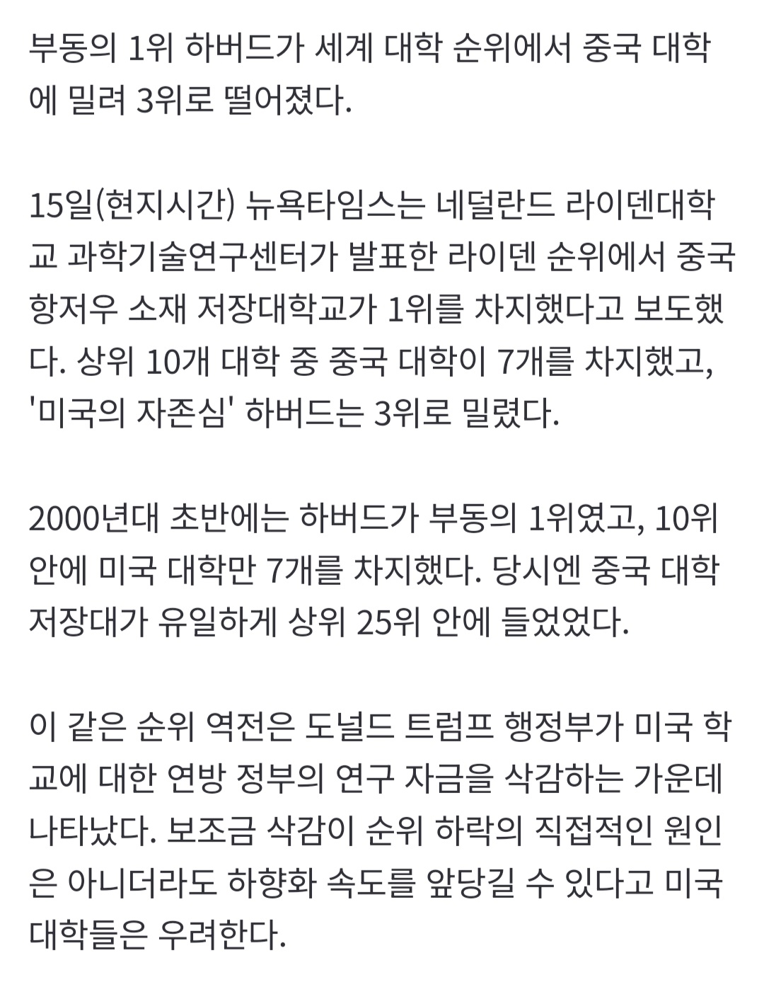 [여시뉴스데스크]하버드 3위에 충격받은 미국…'세계 1위 대학' 중국에 밀렸다 작성자머하시는거에용|작성시간26.01.18|조회수7,585 목록 댓글 24 글자크기 작게가 글자크기 크게가 출처: 여성시대 머하시는거에용전문은 https://naver.me/xpBEM5Vh하버드 3위에 충격받은 미국…'세계 1위 대학' 중국에 밀렸다부동의 1위 하버드가 세계 대학 순위에서 중국 대학에 밀려 3위로 떨어졌다. 15일(현지시간) 뉴욕타임스는 네덜란드 라이덴대학교 과학기술연구센터가 발표한 라이덴 순위에서 중국 항저우 소재n.news.naver.com 다음검색 현재 게시글 추가 기능 열기 북마크 공유하기 신고 센터로 신고 댓글 댓글 24 댓글쓰기 답글쓰기 댓글 리스트 작성자제로레모네이드 | 작성시간 26.01.19 헐 ㅁㅊ 북경대도 아닌 저장대가 1위라고...?? 작성자AMDL | 작성시간 26.01.19 하버드 반유대주의 시위때문에 트럼프가 펀드 삭감해서 생긴일 아님? 진짜 등신같아 작성자욕 줄이기 | 작성시간 26.01.19 순위 기준을 보긴 해야겠지만 꽤 충격적이네 작성자시어머니 형님 | 작성시간 26.01.19 중국어 배워야하나 작성자뇽뇽뇽용뇽뇽 | 작성시간 26.01.19 트럼프 스불재 ㅋㅋ 댓글 전체보기