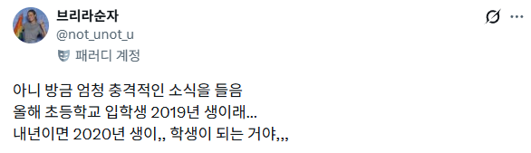 [흥미돋]올해 초등 1학년 태어난 연도 작성자웃음할당량|작성시간26.01.18|조회수21,886 목록 댓글 20 글자크기 작게가 글자크기 크게가 출처: https://x.com/not_unot_u/status/2012789717365149983?s=20 2019년생(코로나 발생일 2019년 11월) 다음검색 현재 게시글 추가 기능 열기 북마크 공유하기 신고 센터로 신고 댓글 댓글 20 댓글쓰기 답글쓰기 댓글 리스트 작성자싱싱활어회 | 작성시간 26.01.19 예??? 진심 어제 태어난 수준 작성자평생소원이옥수수 | 작성시간 26.01.19 미쳤구나......... 작성자뫄뫄야몰자 | 작성시간 26.01.19 헐 거짓말ㅠ 작성자이츠실제상황 | 작성시간 26.01.19 네? 구라치지마세료… 내 학번보다 아래인 아이들이… 걷고 말을 한다고요? 작성자화내봤자실속없다 | 작성시간 26.01.19 ㄹㅇ?.. 구라치지맞ㄴ짜 댓글 전체보기