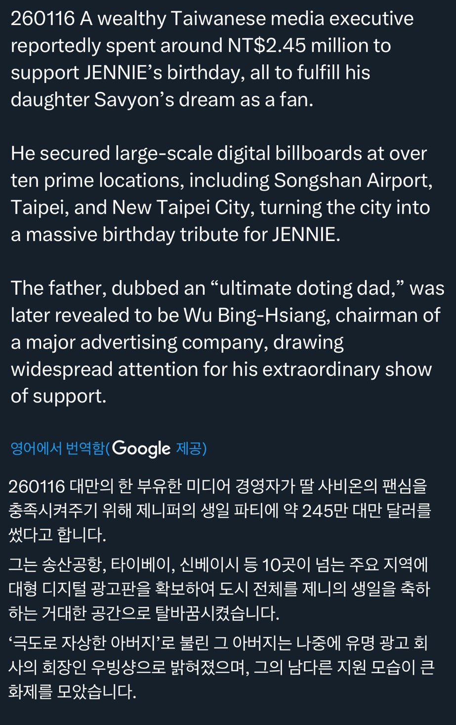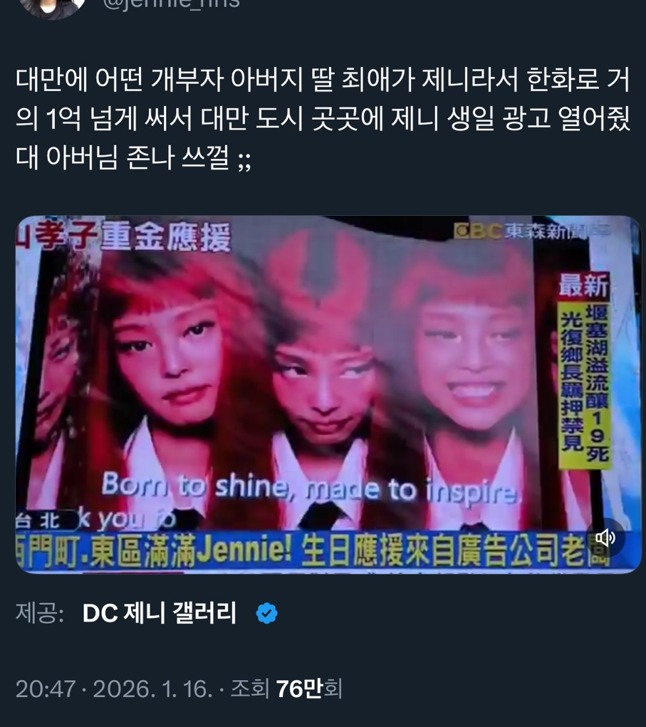 나는 개부자 팬이라면 제니를 초대, 콘서트 열어주기(?) 이런걸줄 알았는데 생일 축하 걸어주기...