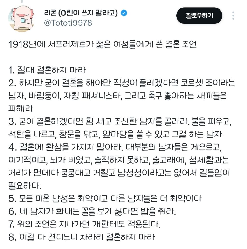 작성자믹스커피하루4개 작성시간 26.01.19 우와 근데 저시대에 저기는 결혼 할지말지 선택할 수 있었나봐??