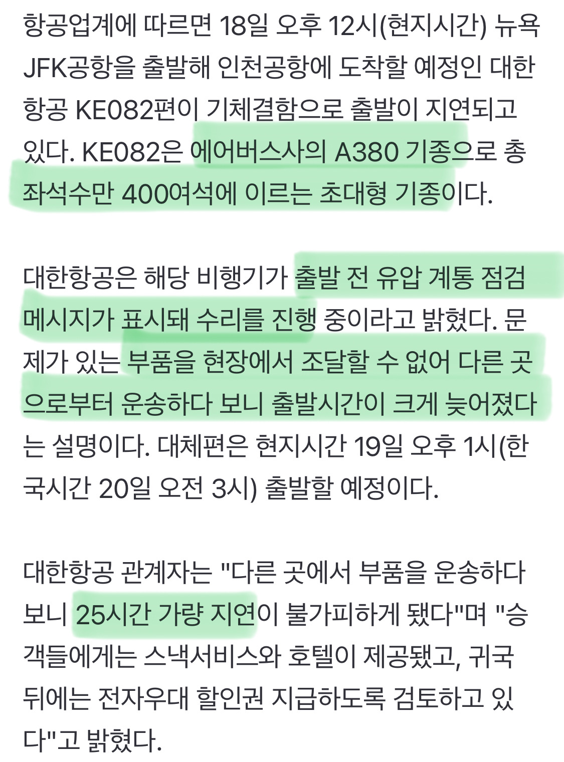 작성자코끼리도풀만먹는데 작성시간 26.01.19 탑승 전인거야? 나는 jkf에서 비행기 탑승하고 기체결함 발견돼서 비행기에서 5시간 갇히고, 결국 23시간 지연돼서 내 스케줄 다 꼬였었지.. ㅇㅅㅇㄴ 였음. 우리나라 사람들은 발 동동 구르고 분노하고 있었음.. 외국인들은 출발 전에 알게돼서 다행이라하고 ㅋㅋ