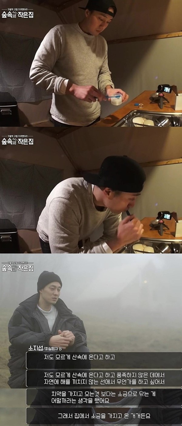 평소에는 아니지만 자연에서 하는 촬영이니 치약대신 소금으로 준비해왔다고