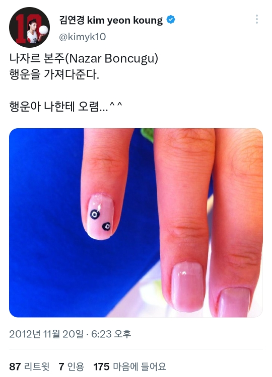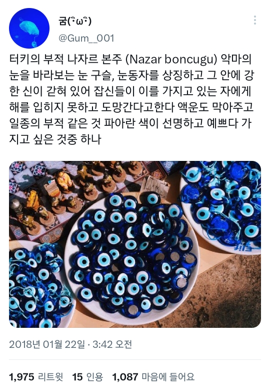 [스크랩] [흥미돋]액운을 막아준다는 튀르키예의 부적 나자르본주🧿(ft.김연경) 작성자수족냉증죽여버려|작성시간26.01.19|조회수28,546 목록 댓글 68 글자크기 작게가 글자크기 크게가 출처 : 여성시대 야채곱창에주먹밥.튀르키예의 부적 나자르본주🧿악마의눈, 블루아이라고도 불림액운이나 악마를 내쫓아준다고 믿는대!크기도 디자인도 가지각색인데드림캐쳐처럼 집에 걸어놓기도 하고작은 나자르본주를 악세사리로 하고 다니기도 함!튀르키예에서 선수 생활을 오래한 김연경도나자르본주를 네일아트로 그려넣기도하고오른쪽 팔에 타투로 새기기도 했음!다른 나라의 문화이니 너무 부정적인 언급은 자제해주세요! 다음검색 스크랩 원문 : *여성시대* 차분한 20대들의 알흠다운 공간 현재 게시글 추가 기능 열기 북마크 공유하기 신고 센터로 신고 댓글 댓글 68 댓글쓰기 답글쓰기 댓글 리스트 작성자스트레칭합시다 | 작성시간 26.01.20 🧿 작성자극우울해서 극우세요? | 작성시간 26.01.20 🧿 작성자하루종읠 | 작성시간 26.01.20 🧿 작성자우논너타도 | 작성시간 26.01.20 🧿 작성자옴뇨뇸 | 작성시간 26.01.20 타투 생각하고 내렸는데 연경님도... 심히 고민되는 군요... 댓글 전체보기