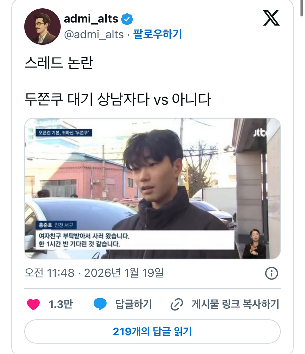 [흥미돋]스레드에서 논란 중이라는 여친 두쫀쿠 사주려고 대기하는 남친 작성자21대 대통령 이재명|작성시간26.01.20|조회수48,156 목록 댓글 174 글자크기 작게가 글자크기 크게가 출처: https://theqoo.net/square/4067019779https://x.com/admi_alts/status/2013081000289374522?s=46 다음검색 현재 게시글 추가 기능 열기 북마크 공유하기 신고 센터로 신고 댓글 댓글 174 댓글쓰기 답글쓰기 댓글 리스트 작성자동마려 | 작성시간 26.01.21 샤넬을 사달랬냐 에르메스를 사달랬냐 7천원짜리 사는건 당연한거지 작성자한남잭 | 작성시간 26.01.21 연애 못하는 한남들은 저런게 발작버튼인가보다^^ 작성자내림올림반올림좌우 | 작성시간 26.01.21 상남자랑 관련있나 걍 여친한테 잘하는 사함 작성자ㅋㅇㄹㄹ | 작성시간 26.01.22 긁🤏 작성자하좃뺑이타임시작 | 작성시간 26.01.22 먼 상남자임.. ㅅ ㅂ 댓글 전체보기